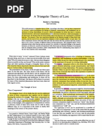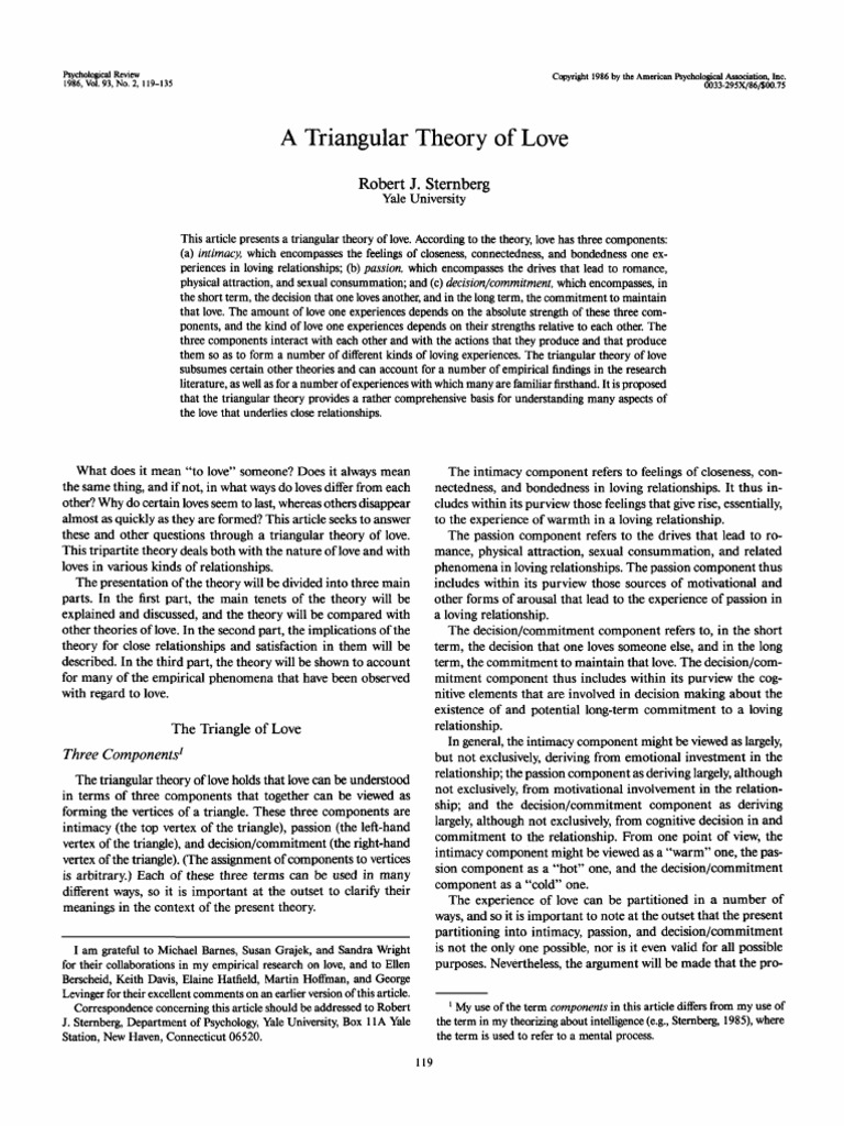 What does it mean "to love" someone? Does it always mean the same thing, and if not, in what ways do loves differ from each other? Why do certain loves seem to last, whereas others disappear almost as quickly as they are formed? This article seeks to answer these and other questions through a triangular theory of love. This tripartite theory deals both with the nature of love and with loves in various kinds of relationships. The presentation of the theory will be divided into three main parts. In the first part, the main tenets of the theory will be explained and discussed, and the theory will be compared with other theories of love. In the second part, the implications of the theory for close relationships and satisfaction in them will be described. In the third part, the theory will be shown to account for many of the empirical phenomena that have been observed with regard to love.