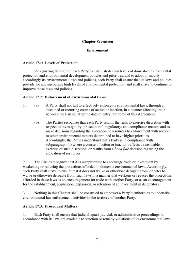 1. (a) A Party shall not fail to effectively enforce its environmental laws, through a