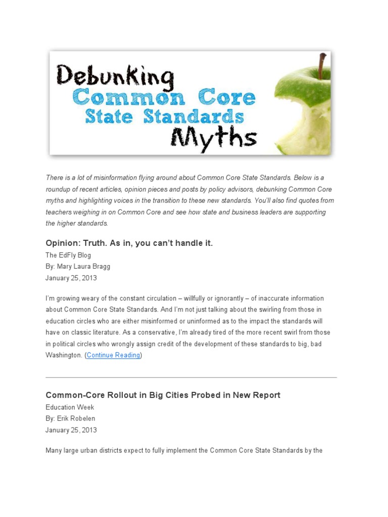 There is a lot of misinformation flying around about Common Core State Standards. Below is a roundup of recent articles, opinion pieces and posts by policy advisors, debunking Common Core myths and highlighting voices in the transition to these new standards. You'll also find quotes from teachers weighing in on Common Core and see how state and business leaders are supporting the higher standards.