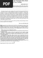 summarized elsewhere (citation); here I (London) will present one image of how they might appear in practice. During the initial phone call with Mary, we talked about who would be important for her to include in the first meeting and why. As Mary talked, she indicated that she was struggling with a number of issues, some of them included her husband, others her mother and most of them her son Johnny. As a therapist I do not know which issue will be the most important for the client to choose as the topic for our first meeting; it is important for me that the client has the freedom to choose who she wants to invite to the first meeting, who the important participants in the conversation are. I do not assume that the family needs therapy, that therapy is the best way to address their particular problem, of that I am the best fit for the family First meeting To help the reader to experience a sample of a possible conversation between a collaborative therapist and Mary, I will present a made up conversation. Please keep in mind that this is only one of the possible conversations that could have happened between Mary and me. Ill pretend that Mary said wasnt sure if she would come to the session alone or if Johnys father or all three of them would come. I am prepared to meet with whoever comes and trusts that Mary and the family know what is best. Mary arrives to the session alone. After greeting her and having small conversation to help us feel comfortable in this first encounter, I might tell her: In our phone