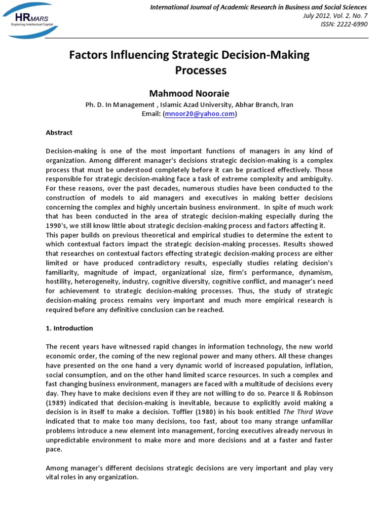This study explores strategic decision-making process and factors affect the processes. The choice to focus on strategic decisions is due to its nature and significance. Strategic decisions are long term, highly unstructured, complex, and inherently risky and have great impact on the future of the organization. Strategic decisions are those important decisions that typically require a large amount of organizational resources, and firms environment consideration. In strategic decisions, top management usually plays a central role, in making the decisions (Hofer & Schendel, 1978). These decisions influence organizational direction, administration, and structure (Christensen et al., 1982). Since strategic decision not only affects the organization in which they are taken but also the society (Colignon & Cray, 1980), it is not surprising that strategic decision-making process has been heavily researched (Amason, 1996). in spite of the crucial role of strategic decisions the strategy process research has not departed significantly from a stage of being based on (Papadakis et al, 1998). Mature paradigms and incomplete assumptions(Eisenhardt & Zbarack, 1992). 2. Literature Review (Strategic Decision-making) The first step in the evolution of strategic management was taken in the late 1950's, when firms developed a systematic approach to deciding where and how the firm will do its future business (Ansoff, 1984). A strategy is a pattern in the organization's important decisions and actions, and consists of a few key areas or things by which the firm is distinguished from others (Digman, 1986). To Drucker, strategy is a purposeful action while to Mintzberg it is a plan, a ploy, a pattern, a position, and a perspective (five Ps). Strategic management is defined as the set of decisions and actions resulting in the formulation and implementation of strategies designed to achieve the objectives of an organization (Pearce II & Robinson, 1985). According to Schwenk (1988) strategic decisions are ill structured, non-routine, and important to the firm, in which top management usually plays a central role (Hofer & Schendel, 1978). Strategic decision-making is incremental and interdependent, shaped by a variety of contextual influences arising from past events, present circumstances, and perspectives of the future (Quinn, 1980; March, 1981; Das, 1986; Neustadt & May, 1986). One of the central features of strategic decisions is their lack of structure (Mintzberg et al., 1976) mainly due to the complexity of the strategic problems (Mason & Mitroff, 1981). Gamble and Thompson (2009) found that a company's strategy consists of competitive moves and approaches management has developed to attract and please customers, conduct operations, grow the business, and achieve performance objectives. 2.1 Strategic Issues Strategic issues can be defined as developments, events and trends having the potential to impact an organizational strategy (Ansoff, 1980; Dutton & Duncan, 1987). These issues can represent problems or opportunities to decision makers. They are important because they affect an organization's ability to achieve its goals or objectives (Dutton & Duncan, 1987). Decision-making on strategic issues generally is treated as strategic decisions and therefore
