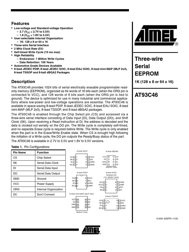 The AT93C46 provides 1024 bits of serial electrically erasable programmable readonly memory (EEPROM), organized as 64 words of 16 bits each (when the ORG pin is connected to VCC), and 128 words of 8 bits each (when the ORG pin is tied to ground). The device is optimized for use in many industrial and commercial applications where low-power and low-voltage operations are essential. The AT93C46 is available in space-saving 8-lead PDIP, 8-lead JEDEC SOIC, 8-lead EIAJ SOIC, 8-lead mini-MAP (MLP 2x3), 8-lead TSSOP, and 8-lead dBGA2 packages. The AT93C46 is enabled through the Chip Select pin (CS) and accessed via a three-wire serial interface consisting of Data Input (DI), Data Output (DO), and Shift Clock (SK). Upon receiving a Read instruction at DI, the address is decoded and the data is clocked out serially on the DO pin. The Write cycle is completely self-timed, and no separate Erase cycle is required before Write. The Write cycle is only enabled when the part is in the Erase/Write Enable state. When CS is brought high following the initiation of a Write cycle, the DO pin outputs the Ready/Busy status of the part. The AT93C46 is available in 2.7V to 5.5V and 1.8V to 5.5V versions. Table 1. Pin Configurations