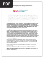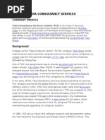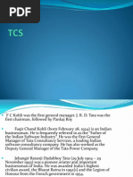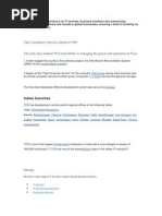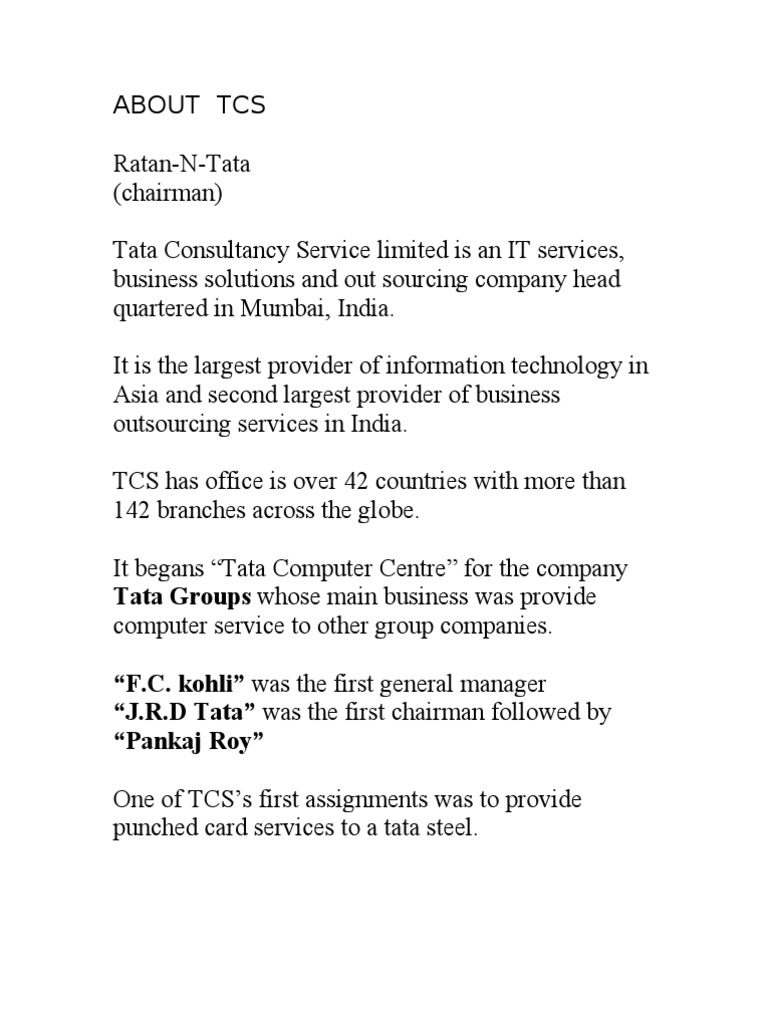 head quartered in Mumbai, India. It is the largest provider of information technology in Asia and second largest provider of business outsourcing services in India. TCS has office is over 42 countries with more than 142 branches across the globe. It begans Tata Computer Centre for the company Tata Groups whose main business was provide computer service to other group companies. F.C. kohli was the first general manager J.R.D Tata was the first chairman followed by Pankaj Roy One of TCSs first assignments was to provide punched card services to a tata steel.