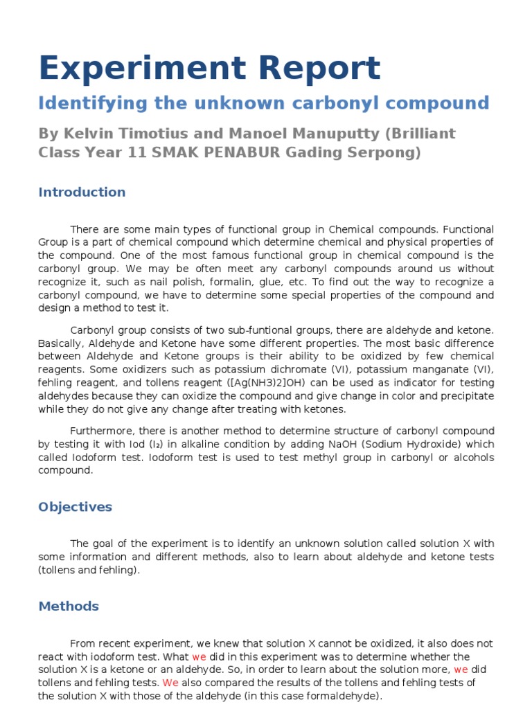 From recent experiment, we knew that solution X cannot be oxidized, it also does not react with iodoform test. What we did in this experiment was to determine whether the solution X is a ketone or an aldehyde. So, in order to learn about the solution more, we did tollens and fehling tests. We also compared the results of the tollens and fehling tests of the solution X with those of the aldehyde (in this case formaldehyde).