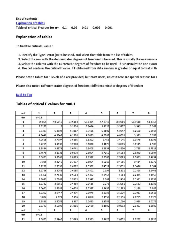 4. The cell contains the critical F value. If F obtained from data analysis is greater or equal to that in the table, then Type I er
