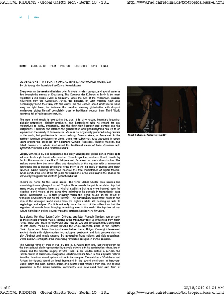By Uh-Young Kim (translated by Daniel Hendrickson) Every year on the weekend in May, colorful floats, rhythm groups, and sound systems ride through the streets of Kreuzberg. The Karneval der Kulturen in Berlin is the most important world music event in Germany. Since the turn of the millennium, musical influences from the Caribbean, Africa, the Balkans, or Latin America have also increasingly found their way into the clubs. But the clichs about world music have hung on tight here, for instance the barefoot dancing globetrotter with dropout tendencies giving himself completely over to traditional sounds from Third World countries full of realness and nature. The new world music is everything but that. It is dirty, urban, boundary breaking, globally networked, digitally produced, and bastardized with no regard for any imperatives to purity, authenticity, and the distinction between pop centers and the peripheries. Thanks to the internet, the globalization of regional rhythms has led to an explosion in the variety of dance music. Music is no longer only produced in big centers in the north, but proliferates in Johannesburg, Buenos Aires, or Budapest. In the northern Mexican city Monterrey alone, three new subgenres have appeared in recent years around the producer Toy Selectah: Cumbia Rebajada, Huichol Musical, and Tribal Guarachero, which short-circuit the traditional music of Latin American with synthesizer melodies and electronic beats. Largely unnoticed by pop magazines and daily newspapers, global dance music spits out one fresh style hybrid after another: Tecnobrega from northern Brazil, Kwaito by South African music stars like DJ Mujava and Professor, or lately Moombahton. The makers come from the inner cities and dancehalls at the equatorwith a permanent connecting line to people wholl proliferate them in the big cities of Europe and North America. Music sharing sites have become the free marketplace of digital folklore. What signifies the end of the fat years for musicians in the west marks the chance for previously marginalized artists to get noticed at all. Theres no name for this loose scene. The term Global Ghetto Tech sounds like something from a cyberpunk novel. Tropical Bass reveals the painless relationship that many young producers have to a kind of exoticism that was once frowned upon by classical world music, at the same time pointing to its genesis in transatlantic bass music. Worldmusic 2.0 in turn primarily marks the digital sound as the result of technical development due to the internet. The participatory movement exceeds the idea of the analogue world music from the eightieswhile still hooking up with its beginnings and edges. For it is not only since the turn of the millennium that the migration of sounds been bringing something new to the world, the hipsters of pop culture have been pulling sounds from the southern hemisphere for years. Jazz giants like Yusuf Lateef, John Coltrane, and later Pharoah Sanders can be seen as the pioneers of world music. Starting in the fifties, they took up influences from North Africa, India, and Brazil to rejuvenate jazzjust as DJs and producers today bring new life into dance music by looking beyond the Anglo-American world. In the eighties, David Byrne and Brian Eno (and even before them, Holger Czukay) interweaved ancient rituals with highly modern technologies: post-punk and funk grooves clashed with Afrobeat and Arabic singers. By introducing found objects and field recordings, Byrne and Eno anticipated the impending revolution brought on by the sampler. The Coldcut remix of Paid in Full by Eric B. & Rakim from 1987 set the program for the transcultural clash represented by sample culture with its combination of rap, break breats, and the Oriental singing of Ofra Haza. In the Brixton district in London, the British center of Caribbean immigration, electronic beats fused in this way with riddims from the Jamaican sound system culture in the sampler. The children of Caribbean and African immigrants found an ideal homeland in the sound continuum of hardcore, jungle, drum and bass, garage, grime, and dubstep that resulted from this. The second generation in the Indian-Pakistani community also developed their own form of