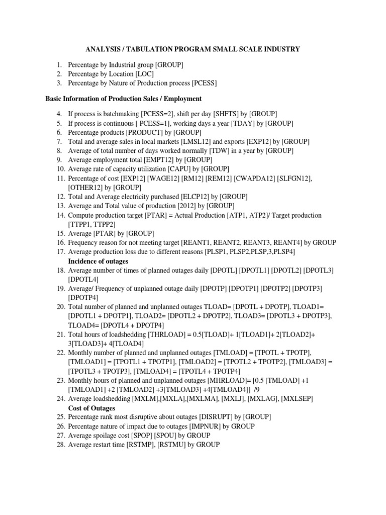 Percentage by Nature of Production process [PCESS] Basic Information of Production Sales / Employment 4. 5. 6. 7. 8. 9. 10. 11. 12. 13. 14. 15. 16. 17. 18. 19. 20. If process is batchmaking [PCESS=2], shift per day [SHFTS] by [GROUP] If process is continuous [ PCESS=1], working days a year [TDAY] by [GROUP] Percentage products [PRODUCT] by [GROUP] Total and average sales in local markets [LMSL12] and exports [EXP12] by [GROUP] Average of total number of days worked normally [TDW] in a year by [GROUP] Average employment total [EMPT12] by [GROUP] Average rate of capacity utilization [CAPU] by [GROUP] Percentage of cost [EXP12] [WAGE12] [RM12] [REM12] [CWAPDA12] [SLFGN12], [OTHER12] by [GROUP] Total and Average electricity purchased [ELCP12] by [GROUP] Average and Total value of production [2012] by [GROUP] Compute production target [PTAR] = Actual Production [ATP1, ATP2]/ Target production [TTPP1, TTPP2] Average [PTAR] by [GROUP] Frequency reason for not meeting target [REANT1, REANT2, REANT3, REANT4] by GROUP Average production loss due to different reasons [PLSP1, PLSP2,PLSP,3,PLSP4] Incidence of outages Average number of times of planned outages daily [DPOTL] [DPOTL1] [DPOTL2] [DPOTL3] [DPOTL4] Average/ Frequency of unplanned outage daily [DPOTP] [DPOTP1] [DPOTP2] [DPOTP3] [DPOTP4] Total number of planned and unplanned outages TLOAD= [DPOTL + DPOTP], TLOAD1= [DPOTL1 + DPOTP1], TLOAD2= [DPOTL2 + DPOTP2], TLOAD3= [DPOTL3 + DPOTP3], TLOAD4= [DPOTL4 + DPOTP4] Total hours of loadshedding [THRLOAD] = 0.5[TLOAD]+ 1[TLOAD1]+ 2[TLOAD2]+ 3[TLOAD3]+ 4[TLOAD4] Monthly number of planned and unplanned outages [TMLOAD] = [TPOTL + TPOTP], [TMLOAD1] = [TPOTL1 + TPOTP1], [TMLOAD2] = [TPOTL2 + TPOTP2], [TMLOAD3] = [TPOTL3 + TPOTP3], [TMLOAD4] = [TPOTL4 + TPOTP4] Monthly hours of planned and unplanned outages [MHRLOAD]= [0.5 [TMLOAD] +1 [TMLOAD1] +2 [TMLOAD2] +3[TMLOAD3] +4[TMLOAD4]] /9 Average loadshedding [MXLM],[MXLA],[MXLMA], [MXLJ], [MXLAG], [MXLSEP] Cost of Outages Percentage rank most disruptive about outages [DISRUPT] by [GROUP] Percentage nature of impact due to outages [IMPNUR] by GROUP Average spoilage cost [SPOP] [SPOU] by GROUP Average restart time [RSTMP], [RSTMU] by GROUP