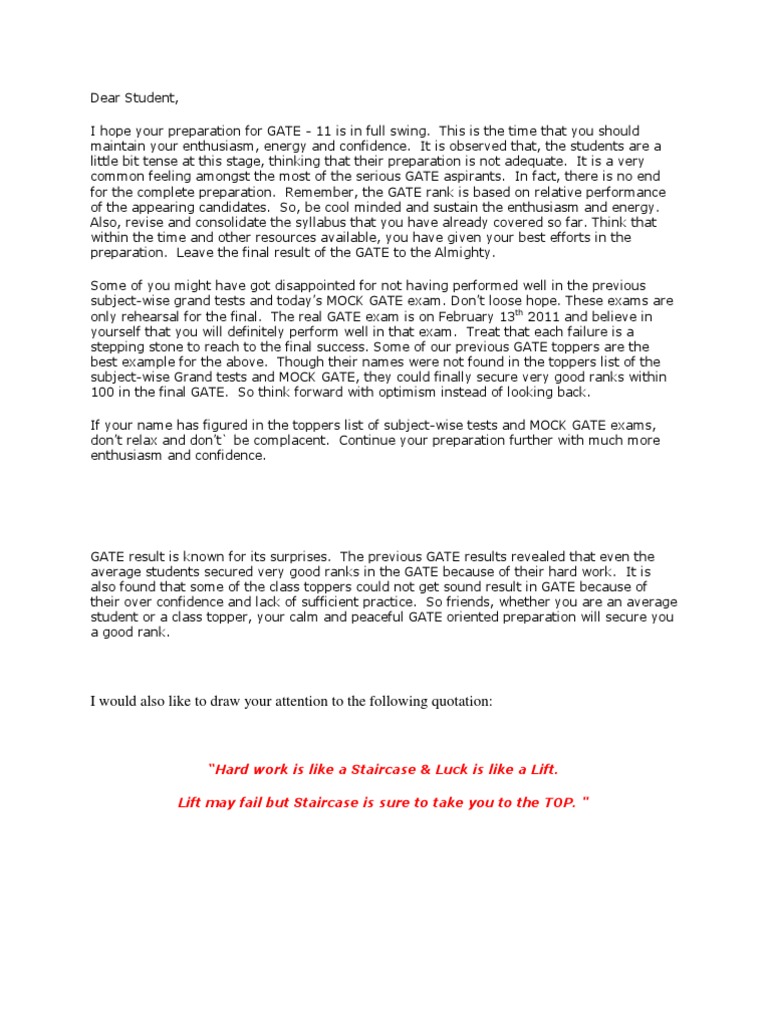 This is the time that you should maintain your enthusiasm, energy and confidence. It is observed that, the students are a little bit tense at this stage, thinking that their preparation is not adequate. It is a very common feeling amongst the most of the serious GATE aspirants. In fact, there is no end for the complete preparation. Remember, the GATE rank is based on relative performance of the appearing candidates. So, be cool minded and sustain the enthusiasm and energy. Also, revise and consolidate the syllabus that you have already covered so far. Think that within the time and other resources available, you have given your best efforts in the preparation. Leave the final result of the GATE to the Almighty. Some of you might have got disappointed for not having performed well in the previous subject-wise grand tests and todays MOCK GATE exam. Dont loose hope. These exams are only rehearsal for the final. The real GATE exam is on February 13th 2011 and believe in yourself that you will definitely perform well in that exam. Treat that each failure is a stepping stone to reach to the final success. Some of our previous GATE toppers are the best example for the above. Though their names were not found in the toppers list of the subject-wise Grand tests and MOCK GATE, they could finally secure very good ranks within 100 in the final GATE. So think forward with optimism instead of looking back. If your name has figured in the toppers list of subject-wise tests and MOCK GATE exams, dont relax and dont` be complacent. Continue your preparation further with much more enthusiasm and confidence.