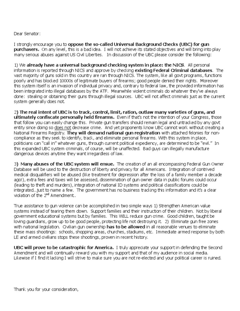 Nutnfancy letter to legislators for Universal Background Checks. Use as is, addressed properly of course, or change as necessary!