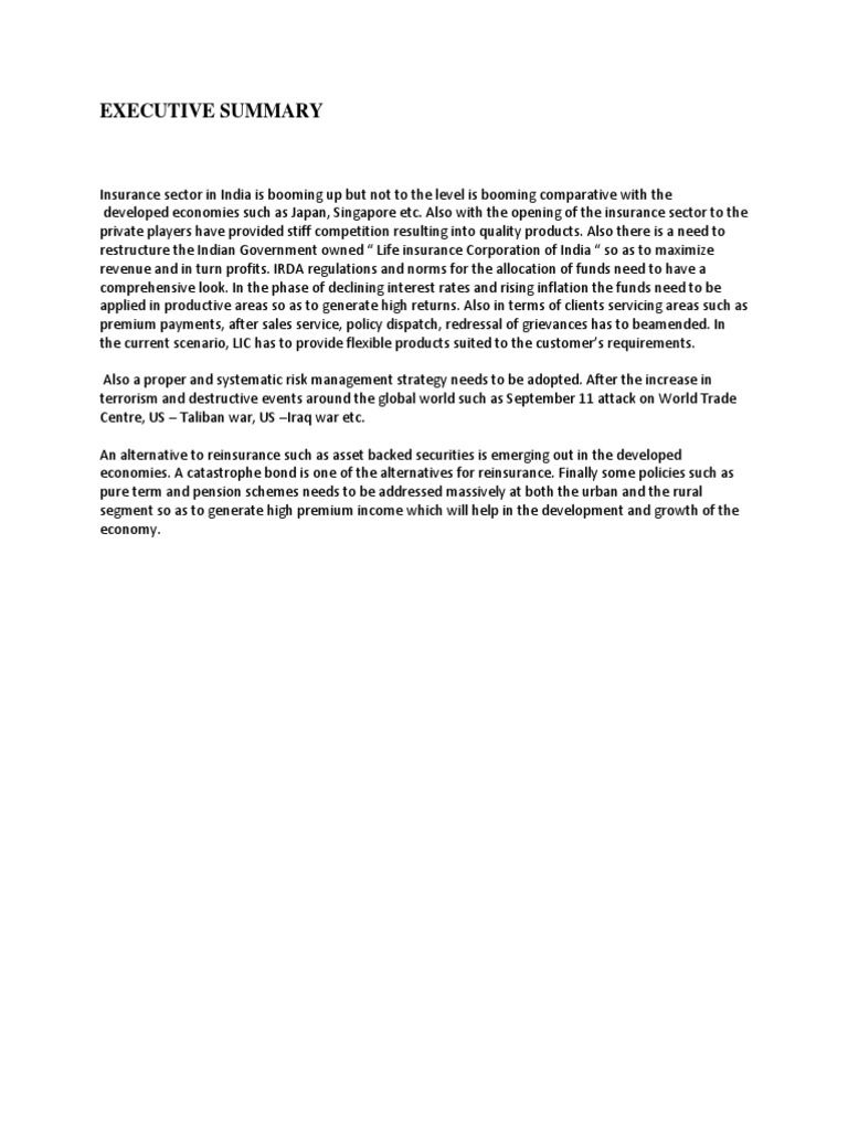 Insurance sector in India is booming up but not to the level is booming comparative with the developed economies such as Japan, Singapore etc. Also with the opening of the insurance sector to the private players have provided stiff competition resulting into quality products. Also there is a need to restructure the Indian Government owned Life insurance Corporation of India so as to maximize revenue and in turn profits. IRDA regulations and norms for the allocation of funds need to have a comprehensive look. In the phase of declining interest rates and rising inflation the funds need to be applied in productive areas so as to generate high returns. Also in terms of clients servicing areas such as premium payments, after sales service, policy dispatch, redressal of grievances has to beamended. In the current scenario, LIC has to provide flexible products suited to the customers requirements. Also a proper and systematic risk management strategy needs to be adopted. After the increase in terrorism and destructive events around the global world such as September 11 attack on World Trade Centre, US Taliban war, US Iraq war etc. An alternative to reinsurance such as asset backed securities is emerging out in the developed economies. A catastrophe bond is one of the alternatives for reinsurance. Finally some policies such as pure term and pension schemes needs to be addressed massively at both the urban and the rural segment so as to generate high premium income which will help in the development and growth of the economy.