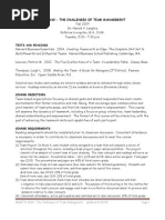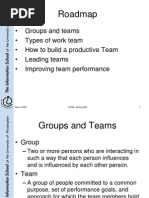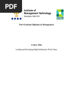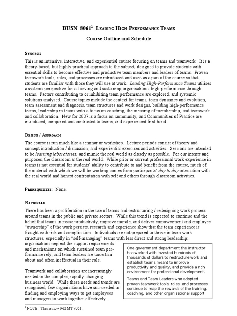 SYNOPSIS This is an intensive, interactive, and experiential course focusing on teams and teamwork. It is a theory-based, but highly practical approach to the subject, designed to provide students with essential skills to become effective and productive team members and leaders of teams. Proven teamwork tools, roles, and processes are introduced and used as a part of the course so that students are familiar with those they will use at work. Leading High-Performance Teams utilises a systems perspective for achieving and sustaining organisational high-performance through teams. Factors contributing to or inhibiting team performance are explored, and systemic solutions analysed. Course topics include the context for teams, team dynamics and evolution, team assessment and diagnosis, team structures and work designs, building high-performance teams, leadership in teams with a focus on coaching, the meaning of membership, and teamwork and collaboration. New for 2007 is a focus on community, and Communities of Practice are introduced, compared and contrasted to teams, and experienced first-hand. DESIGN / APPROACH The course is run much like a seminar or workshop. Lecture periods consist of theory and concept introduction / discussion, and experiential exercises and activities. Sessions are intended to be learning laboratories, and mimic the real world as closely as possible. For our intents and purposes, the classroom is the real world. While prior or current professional work experience in teams is not essential for students ability to contribute to and benefit from the course, much of the material with which we will be working comes from participants day to day interaction with the real world and honest confrontation with self and others through classroom activities. PREREQUISITES: None. RATIONALE There has been a proliferation in the use of teams and restructuring / redesigning work process around teams in the public and private sectors. While this trend is expected to continue and the belief that teams increase productivity, improve morale, and deliver empowerment and employee ownership of the work persists, research and experience show that the team experience is fraught with risk and complication. Individuals are not prepared to thrive in team work structures, especially in self-managing teams with less direct and strong leadership; organisations neglect the support requirements One government department the instructor and mechanisms on which sustained team perhas worked with invested hundreds of formance rely; and team leaders are uncertain thousands of dollars to restructure work and about and often ineffectual in their role. establish teams meant to improve Teamwork and collaboration are increasingly needed in the complex, rapidly-changing business world. While these needs and trends are recognised, few organisations have suc-ceeded in finding and employing ways to get employees and managers to work together effectively.