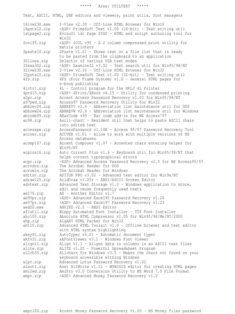 Accent Money Password Recovery v1.00 - MS Money files password recovering utility ANS2ASC v0.3 - ANSI 2 ASCII Converter Anfy 3D v1.2 for Win95/NT - 3D effects for use in web pages Anfy v1.4.5 for Win95/NT - Special effects for web pages Another Notepad v1.23 - Windows Text Editor Another Notepad v1.23.32 - Win32 Text Editor ANSI 2 ASCII Text Converter v1.20 ANSI Graphics Visualiser v1.1 <ASP> Advanced Office 2000 Password Recovery v1.0 Pro <ASP> Advanced Office 95 Password Recovery v1.11 <ASP> Advanced Office 97 Password Recovery v1.33 <ASP> Advanced PDF Password Recovery v1.11 ANSI PLUS v4.04 - Console driver for MSDOS/Win3/Win'95 <ASP> Advanced Paradox Password Recovery v1.0 Acrobat Reader v4.05b for Windows Arachnophilia v4.0 - Web Page Wor shop for Windows95 AS-EASY-AS v5.7 - Spreadsheet program for DOS AS-EASY-AS Help file AS-EASY-AS v1.6 for Win95 - Spreadsheet program ASC v1.0 - ASCII Code Finder ASC TO HTM v3.3 - Text files to HTML converter for Win9x/NT/2K ASCII Table Resident Viewer v3.50 ASCII Art v1.1 - Creates ASCII Screens <ASP> ASCII Convert v1.8 - ASCII files processor ASCII DRAW v3.1 Resident ASCII table AstroHelp v1.11 for WinWord v.6,7 - Add-on for developing Windows Help files ACESOFT SUBLIMATE WRITING INTO TEXT for DOS/Win - ASC2 normaliser/HTML address extractor Compare v1.8 - ASCII files comparator HaCKeR style text reader/ma er AUTOHTML v7.2 - Text 2 HTML Convertor Aurora v3.0c - 286 executable Aurora v3.0c - Powerful Text Editor for DOS Autogrep - Menu driven grep-li e utility AutoInsult v3.2 - Insult generator for Win32 AutoText v1.3 - TXT 2 EXE Converter ACID View v4.36 - ANSI, RIP & GIF Viewer ANSI View v2.0 - 32-bit ANSI Viewer Art Worx v0.65 (Beta) - ANSI Editor <ASP> Advanced Word95 Password Recovery v1.20 <ASP> Advanced Word97 Password Recovery v1.23 Accent Word Password Recovery v1.0 - Util for recovering password to MS Word 6-9 documents AWS v3.5 - ASCII drawing tool AXGDC v1.0 - NG compatible compiler/lin er AYPad v1.2 - Notepad replacement AYPaste v1.1 - Util for pasting text into application incl. WWW browsers Barcode generator for PCL*-based printers BATCHCNV - Utility to VIEW program BATCON v1.0 - A collection of batch files for text format conversions (ASCII,HTML,NG,HLP,RTF,DOC...) Binary ANSI Viewer v1.21 Blac board Grep 32 for Win95/NT - Text string search utility BDBFS v1.14c - DBF Editor for xBase Professionals (in Russian) BDBFS v1.14c - DBF Editor for xBase Professionals BCC-DIZ v1.3 DIZ Files Displayer for Win32