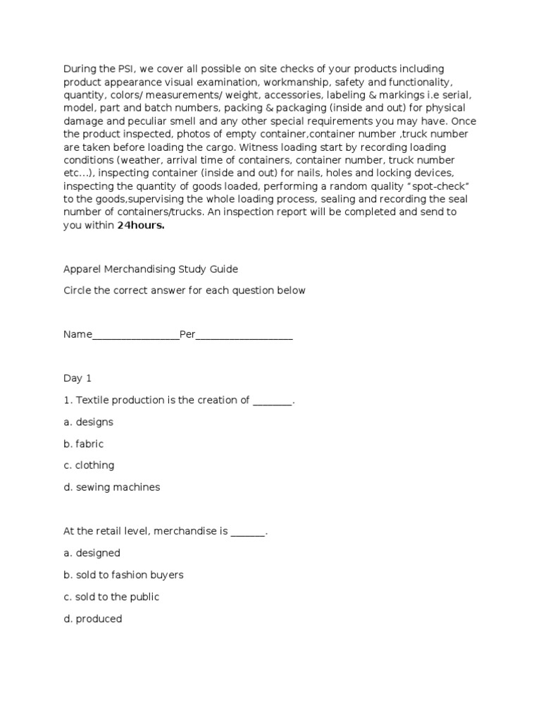 Apparel Merchandising Study Guide Circle the correct answer for each question below