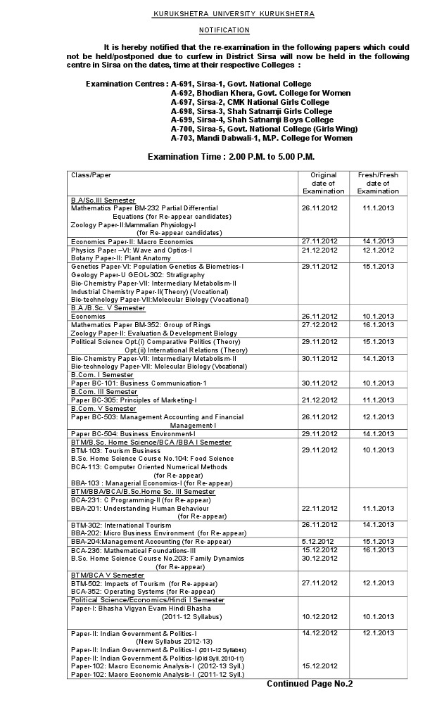 Copy of the above is forwarded to the following for information and necessary action:1. The Director, Internet Cell, KUK to place the notice on the University website. 2. Principal, Govt. National College, Sirsa. He is requested to inform all the concerned candidates. 3. Centre Supdt.(A-691), Sirsa-1, Govt. National College. 4. Principal, CMK National Girls College Sirsa. He is requested to inform all the concerned candidates. 5. Centre Supdt.(A-697), Sirsa-2, CMK National College. 6. Principal, Shah Satnamji Girls College Sirsa. He is requested to inform all the concerned candidates. 7. Centre Supdt.(A-698), Sirsa-3, Shah Satnamji Girls College. 8. Principal, Shah Satnamji Boys College Sirsa. He is requested to inform all the concerned candidates. 9. Centre Supdt.(A-699), Sirsa-4, Shah Satnamji Boys College. 10. Principal, Govt. National College (Girls Wing), Sirsa. He is requested to inform all the concerned candidates. 11. Centre Supdt.(A-700), Sirsa-5,Govt. National College (Girls Wing) 12. Principal, Govt. College for Women. Bhodian Khera. 13. Centre Supdt.(A-692), Bhodian Khera, Govt. College for Women. 14. Principal, Ch.Mani Ram Jhorar Govt. College, Mithi Sureran, Ellenabad (Sirsa) 15. Assistant Registrar (R-I/II/III), K.U. Kurukshetra. 16. Assistant Registrar (Secrecy), K.U. Kurukshetra. 17. Assistant Registrar(Confidential) to the Controller of Examinations. 18. P.R.O., KUK with the request to issue a Press release in this regard. 19. CT-II (Conduct Theory Section). Sd/Deputy Registrar(Conduct)