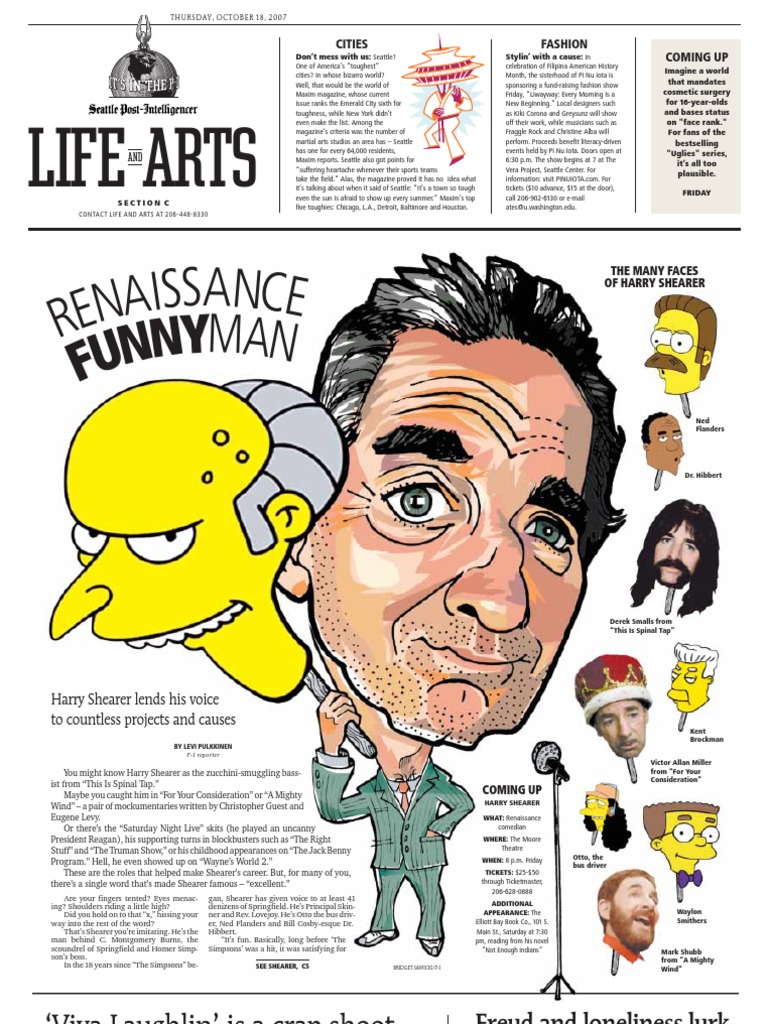 me because it was an opportunity to do multiple voices, Shearer said. And thats what I like to do. Shearers larger longing, though, is to entertain, and he does so with rare range. The animated work hides his physicality, which is one of his great gifts. He can effortlessly slide into whacked-out roles using his affable eyes and elastic face to transform himself. Where wig and wardrobe would turn Spinal Taps Derek Smalls or A Mighty Winds Mark Shubb into half-alive caricatures, Shearers earnestness grounds the characters and keeps them endearingly human. He has made his mark playing pathetic personae and filling them with sadly comic warmth recall his turn in Waynes World 2 as Handsome Dan, the skinny, badly balding radioman. This spring at a London theater, Shearer plans to train his talents on one of the 20th centurys great tragic figures, J. Edgar Hoover. The production J. Edgar! The Musical has been an offand-on project for Shearer and writing partner Tom Leopold for nearly a decade. Shearer said he has been intrigued by the challenge of finding humor in the story of the hard-boiled cross-dresser who headed the FBI. Hes a funny character a homophobic homosexual, Shearer said. He was the center of an awful lot of the craziness that was 20th-century America. Shearer, 63, will be at the Moore Theatre on Friday showcasing his varied talents. The evening starts at 8 with Shearer offering his take on politics and pop culture. He rounds out the performance with what he calls a show business flourish. For Shearer, the show is a chance to connect with his fans. I love the immediacy of talking with an audience, he said. Every time you do that, youre sort of calibrating your performance based on how they respond. umentary This Is Spinal Tap cemented his place in popular culture. Recently, Shearer has sought other outlets for his Harry Shearer: satirical silactor, activist, writer, radio host liness. In 2006, ... he released his first novel, Not Enough Indians, the tongue-in-cheek tale of residents of a bankrupt small town who decide to form a tribe. Writing the novel, he said, fulfilled a dream one shared by anyone who has considered himself a writer. Shearer followed the book this year with the album Songs Pointed & Pointless, his third collection of music. Many of the songs which are sometimes witty, sometimes biting had their genesis on his syndicated National Public Radio program, Le Show (which plays at 3 p.m. Sundays on KXOT-FM 91.7 in Tacoma. His work also appears online at mydamnchannel.com.). The songs all sort of have their first life on my radio show, which was sort of a demo version of them, he said. Its something thats kind of fallen out of fashion, which is comedy songs that arent parody. One song Waterboardin U.S.A. pushes satire, setting lyrics about the infamous torture technique to a Beach Boys-style tune. Its a pleasure so rare, seeing captives gulp air, sings Shearer, sporting a leathery tan and a floral-print shirt for the songs video (available at mydamnchannel.com). Lets go waterboardin U.S.A. Shearer said he wrote the song after hearing bland denials from the U.S. government about the treatment of Guantanamo prisoners. Spinal Tap alums Guest and Michael McKean join Shearer on the album, as does his wife, Welsh singer Judith Owen, and several musicians from New Orleans, the couples adopted home.