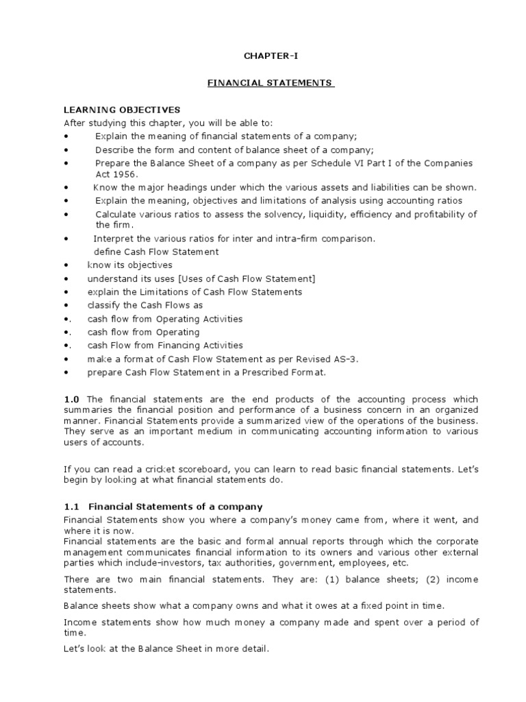 . . . Explain the meaning of financial statements of a company; Describe the form and content of balance sheet of a company; Prepare the Balance Sheet of a company as per Schedule VI Part I of the Companies Act 1956. Know the major headings under which the various assets and liabilities can be shown. Explain the meaning, objectives and limitations of analysis using accounting ratios Calculate various ratios to assess the solvency, liquidity, efficiency and profitability of the firm. Interpret the various ratios for inter and intra-firm comparison. define Cash Flow Statement know its objectives understand its uses [Uses of Cash Flow Statement] explain the Limitations of Cash Flow Statements classify the Cash Flows as cash flow from Operating Activities cash flow from Operating cash Flow from Financing Activities make a format of Cash Flow Statement as per Revised AS-3. prepare Cash Flow Statement in a Prescribed Format.