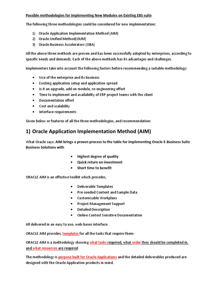 for new implementation: 1) Oracle Application Implementation Method (AIM) 2) Oracle Unified Method(OUM) 3) Oracle Business Accelerators (OBA) All the above three methods are proven and has been successfully adopted by enterprises, according to specific needs and demands. Each of the above methods has its advantages and challenges. Implementers take into account the following factors before recommending a suitable methodology: Size of the enterprise and its business Existing application setup and application spread Is it an upgrade, add on module, re-engineering effort Time to implement and availability of ERP project teams with the client Documentation effort Cost and scalability Interface requirements