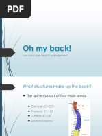 Discogenic back pain Cauda Equina Syndrome Fracture (compression, spinosus process, stress fractures of pars) SI dysfunction Non-back pain infection (AAA, Pancreatitis, posterior penetrating ulcer and pyelonephritis) Metastatic disease (prostate, renal cell, thyroid, breast)