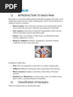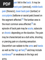 1)Back pain is pain felt in the back that usually originates from the muscles, nerves, bones, joints or other structures in the spine. Back pain may have a sudden onset or can be a chronic pain; it can be constant or intermittent, stay in one place or radiate to other areas. It may be a dull ache, or a sharp or piercing or burning sensation. The pain may radiate into the arms and hands as well as the legs or feet, and may include symptoms other than pain. These symptoms may include tingling, weakness or numbness. Back pain is one of humanity's most frequent complaints. In the U.S., acute low back pain (also called lumbago) is the fifth most common reason for physician visits. About nine out of ten adults experience back pain at some point in their life, and five out of ten working adults have back pain every year.[1] The spine is a complex interconnecting network of nerves, joints, muscles, tendons and ligaments, all of which are capable of producing pain. Large nerves that originate in the spine and go to the legs and arms can make pain radiate to the extremities.[2] Back pain is usually defined as either acute or chronic. Doctors may diagnose low back pain as acute if it lasts less than a month. Most cases clear up in a few days without medical attention, although recurrence after a first attack is common. If the pain persists for over 3 months, it is considered chronic back pain, this constitutes only 1% to 5% of back pain cases.