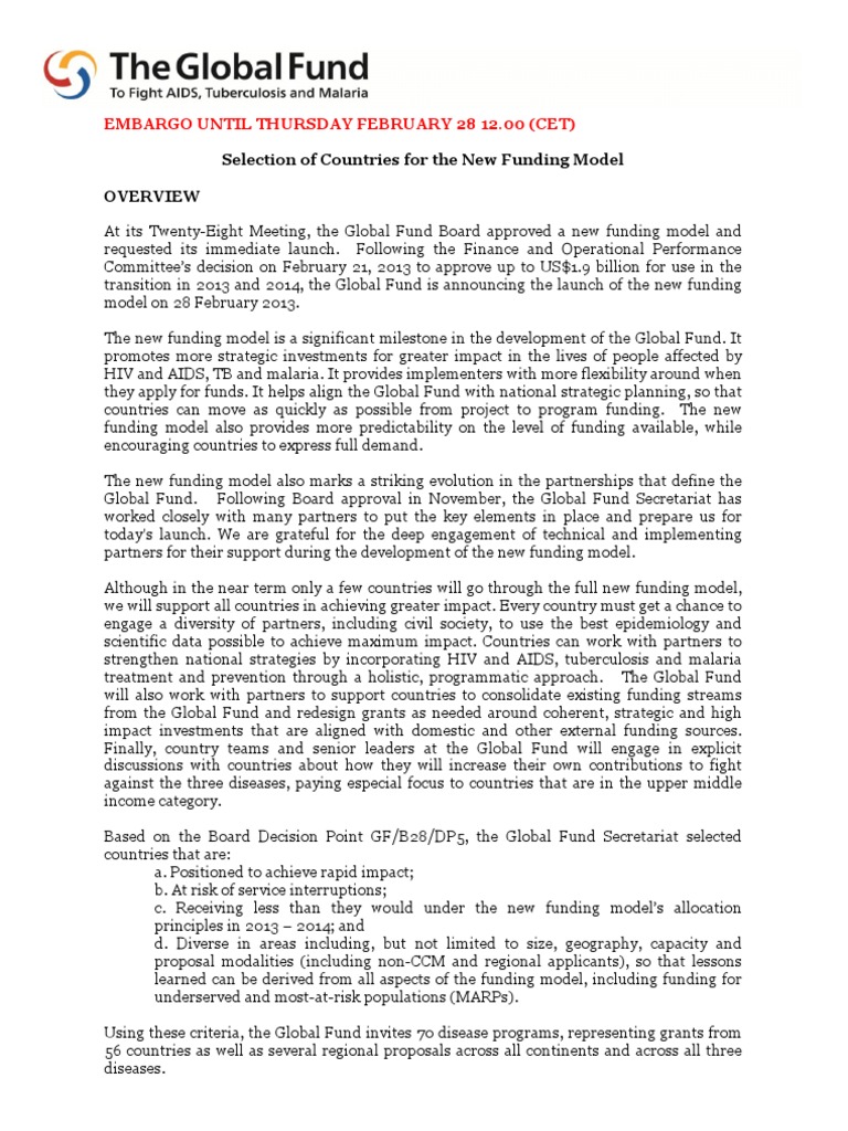 The Global Fund to Fight AIDS, TB and Malaria announced the first six countries to receive grants under its new funding model on 26 Feb. This document explains more about country selection and the new funding.