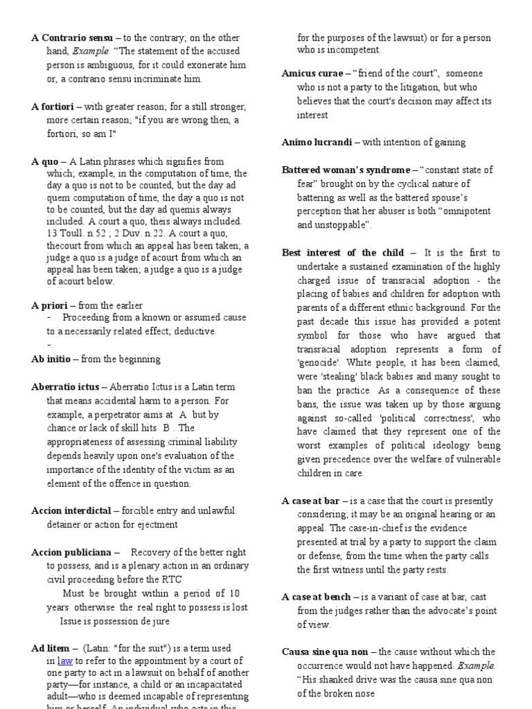 . The statement of the accused person is ambiguous, for it could exonerate him or, a contrario sensu incriminate him. A fortiori with greater reason; for a still stronger, more certain reason; "if you are wrong then, a fortiori, so am I" A quo A Latin phrases which signifies from which; example, in the computation of time, the day a quo is not to be counted, but the day ad quem computation of time, the day a quo is not to be counted, but the day ad quemis always included. A court a quo, theis always included. 13 Toull. n.52 ; 2 Duv. n.22. A court a quo, thecourt from which an appeal has been taken; a judge a quo is a judge of acourt from which an appeal has been taken; a judge a quo is a judge of acourt below. A priori from the earlier - Proceeding from a known or assumed cause to a necessarily related effect; deductive. Ab initio from the beginning Aberratio ictus Aberratio Ictus is a Latin term that means accidental harm to a person. For example, a perpetrator aims at A but by chance or lack of skill hits B. The appropriateness of assessing criminal liability depends heavily upon one's evaluation of the importance of the identity of the victim as an element of the offence in question. Accion interdictal forcible entry and unlawful detainer or action for ejectment Accion publiciana Recovery of the better right to possess, and is a plenary action in an ordinary civil proceeding before the RTC Must be brought within a period of 10 years otherwise the real right to possess is lost Issue is possession de jure Ad litem (Latin: "for the suit") is a term used in law to refer to the appointment by a court of one party to act in a lawsuit on behalf of another partyfor instance, a child or an incapacitated adultwho is deemed incapable of representing him or herself. An individual who acts in this capacity is generally called a guardian ad litem legal Latin meaning "for the purposes of the legal action only." Most often the term applies to a parent who files a lawsuit for his or her minor child as "guardian at litem" (guardian just