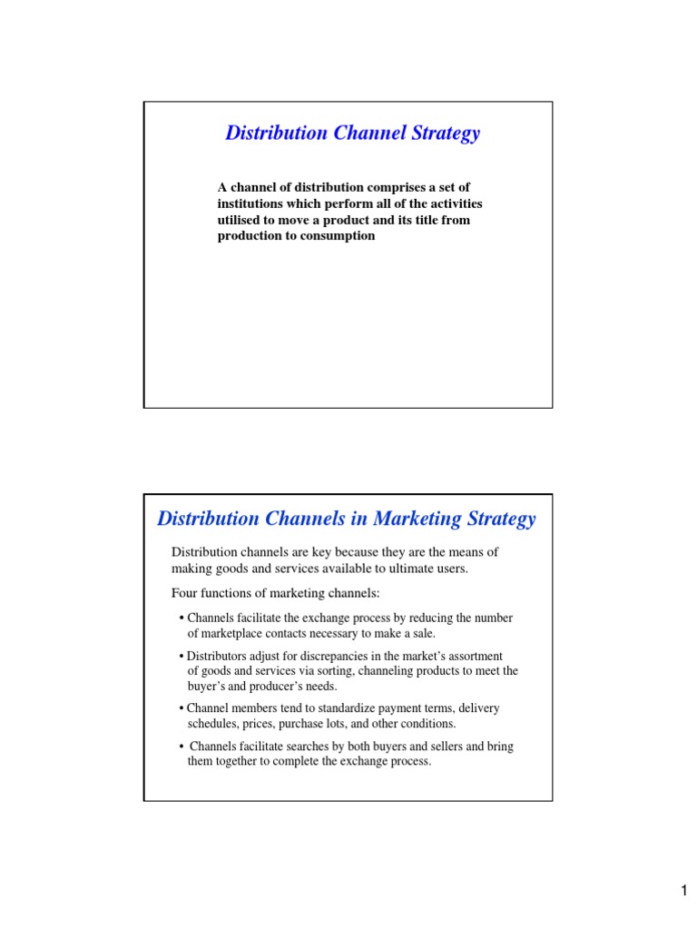 Distribution channels are key because they are the means of making goods and services available to ultimate users. Four functions of marketing channels: Channels facilitate the exchange process by reducing the number