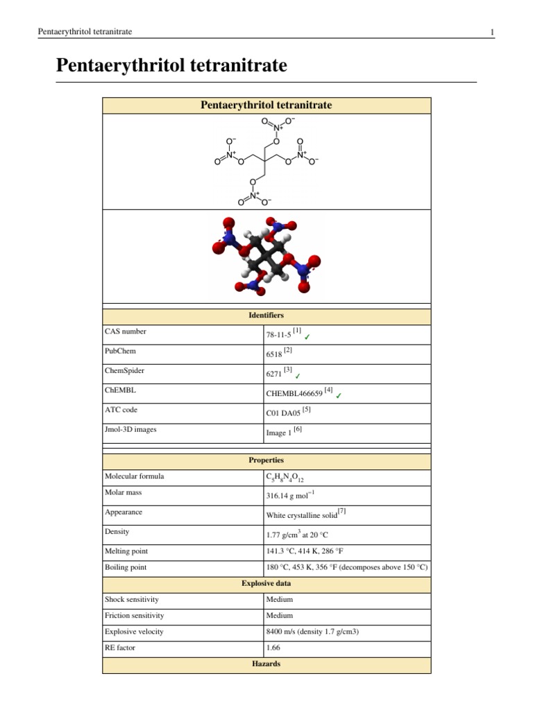 [14] Manuchair S. Ebadi (1998) (Google Books excerpt). CRC desk reference of clinical pharmacology (http:/ / books. google. com/ books?id=-EAxShTKfGAC& pg=PA383). p.383. ISBN978-0-8493-9683-0. . [15] Tollens, B.; Wigand, P. (1891). "ber den Penta-Erythrit, einen aus Formaldehyd und Acetaldehyd synthetisch hergestellten vierwerthigen Alkohol (On penta-erythritol, a tetravalent alcohol synthetically produced from formaldehyde and acetaldehyde)" (http:/ / books. google. com/ books?id=hjI0AQAAMAAJ& pg=PA316#v=onepage& q& f=false). Justus Liebig's Annalen der Chemie 265: 316340. doi:10.1002/jlac.18912650303. . [16] Stettbacher, Alfred (1933). Die Schiess- und Sprengstoffe (2. vllig umgearb. Aufl. ed.). Leipzig: Barth. p.459. [17] M. F. Foltz. Aging of Pentaerythritol Tetranitrate (PETN) (https:/ / e-reports-ext. llnl. gov/ pdf/ 372573. pdf). Lawrence Livermore National Laboratory. [18] Thermal decomposition of PENT and HMX over a wide temperature range (http:/ / www. intdetsymp. org/ detsymp2002/ PaperSubmit/ FinalManuscript/ pdf/ German-258. pdf) by V.N. German et al. [19] Li Zhuang, Lai Gui and Robert W. Gillham (2008). "Degradation of Pentaerythritol Tetranitrate (PETN) by Granular Iron". Environ. Sci. Technol. 42: 4534. doi:10.1021/es7029703. PMID18605582. [20] Jacques Boileau, Claude Fauquignon, Bernard Hueber, Hans H. Meyer (2005), "Explosives", Ullmann's Encyclopedia of Industrial Chemistry, Weinheim: Wiley-VCH, doi:10.1002/14356007.a10_143.pub2 [21] Winslow, Ron. (2009-12-29) A Primer in PETN [Link] (http:/ / online. wsj. com/ article/ SB126195987401406861. html). [Link]. Retrieved on 2010-02-08. [22] Oxley, Jimmie C.; Smith, James L.; Kirschenbaum, Louis J.; Shinde, Kajal. P.; Marimganti, Suvarna (2005). "Accumulation of Explosives in Hair". Journal of Forensic Sciences 50: 1. doi:10.1520/JFS2004545. [23] . http:/ / www. latimes. com/ news/ nationworld/ nation/ wire/ sc-dc-1124-petn-20101123,0,2000499. story. [24] Kenneth Chang (December 27, 2009). "Explosive on Flight 253 Is Among Most Powerful" (http:/ / www. nytimes. com/ 2009/ 12/ 28/ us/ 28explosives. html?ref=us). The New York Times. . [25] "Primacord Technical Information" (http:/ / www. dynonobel. com/ files/ 2010/ 04/ Primacord. pdf). Dyno Nobel. . Retrieved April 22, 2009. [26] PETN (chemical compound) Britannica Online Encyclopedia (http:/ / www. britannica. com/ EBchecked/ topic/ 454067/ PETN). [Link]. Retrieved on 2010-02-08. [27] Lillian Hoddeson, Paul W. Henriksen, Roger A. Meade, Catherine L. Westfall, Gordon Baym, Richard Hewlett, Alison Kerr, Robert Penneman, Leslie Redman, Robert Seidel (2004) (Google Books excerpt). A Technical History of Los Alamos During the Oppenheimer Years, 19431945 (http:/ / books. google. com/ books?id=KoTve97yYB8C& pg=PA164). pp.164173. ISBN978-0-521-54117-6. . [28] Information Bridge: DOE Scientific and Technical Information Sponsored by OSTI (http:/ / www. osti. gov/ bridge/ servlets/ purl/ 650196-rV1bU0/ webviewable/ 650196. pdf). [Link] (2009-11-23). Retrieved on 2010-02-08. [29] Tarzhanov, V. I.; Zinchenko, A. D.; Sdobnov, V. I.; Tokarev, B. B.; Pogrebov, A. I.; Volkova, A. A. (1996). "Laser initiation of PETN". Combustion, Explosion, and Shock Waves 32: 454. doi:10.1007/BF01998499. [30] US Army Encyclopedia of Explosives and Related Items, vol.8 [31] Simulation of ram accelerator with PETN layer (http:/ / fluid. ippt. gov. pl/ ictam04/ CD_ICTAM04/ FM3/ 12843/ FM3_12843. pdf), Arkadiusz Kobiera and Piotr Wolanski, XXI ICTAM, 1521 August 2004, Warsaw, Poland [32] Wei-Guang Liu et al. (2009). "Explanation of the Colossal Detonation Sensitivity of Silicon Pentaerythritol Tetranitrate (Si-PETN) Explosive" (http:/ / www. wag. caltech. edu/ publications/ sup/ pdf/ 806. pdf). J. Am. Chem. Soc. 131: 7490. doi:10.1021/ja809725p. PMID19489634. . [33] Computational Organic Chemistry Si-PETN sensitivity explained (http:/ / comporgchem. com/ blog/ ?p=258). [Link] (2009-07-20). Retrieved on 2010-02-08. [34] "Article detailing attack on Maison de France in Berlin (German)" (http:/ / www. spiegel. de/ panorama/ 0,1518,56218,00. html). [Link]. December 13, 1999. . Retrieved November 4, 2010. [35] "'Shoe bomb suspect 'did not act alone'" (http:/ / news. bbc. co. uk/ 2/ hi/ americas/ 1783237. stm). BBC News. January 25, 2002. . Retrieved April 22, 2009. [36] "Saudi suicide bomber hid IED in his anal cavity" (http:/ / homelandsecuritynewswire. com/ saudi-suicide-bomber-hid-ied-his-anal-cavity). Homeland Security Newswire. September 9, 2009. [37] Andrew England (November 1, 2010). "Bomb clues point to Yemeni terrorists". Financial Times. [38] "Saudi Bombmaker Key Suspect in Yemen Plot" (http:/ / www. cbsnews. com/ stories/ 2010/ 11/ 01/ world/ main7010288. shtml). CBS News. November 1, 2010. . Retrieved November 2, 2010. [39] "Al Qaeda Claims Responsibility for Attempted Bombing of U.S. Plane" (http:/ / www. foxnews. com/ story/ 0,2933,581307,00. html). FOX News Network. December 28, 2009. . Retrieved December 29, 2009. [40] "Criminal Complaint" (http:/ / big. assets. huffingtonpost. com/ AbdumutallabCharges. pdf) (PDF). Huffington Post. . Retrieved November 4, 2010. [41] "'Investigators: Northwest Bomb Plot Planned by al Qaeda in Yemen'" (http:/ / abcnews. go. com/ Blotter/ northwest-bomb-plot-planned-al-qaeda-yemen/ story?id=9426085& page=1). ABC News. December 26, 2009. . Retrieved December 26, 2009. [42] Explosive in Detroit terror case could have blown hole in airplane, sources say (http:/ / www. washingtonpost. com/ wp-dyn/ content/ article/ 2009/ 12/ 28/ AR2009122800582. html) [Link]. Retrieved on 2010-02-08.