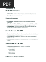 STRATA TITLE Strata title is a form of title over parts of real property which originally designed to facilitate ownership and mortgage of separate parts of a building, often on multiple levels. Generally, the term strata refer to apartments which are being on different levels.1 It means that each separate and individual part of a building which is known as parcel would be issued with an individual title. Generally the properties that could be issued with strata titles are as following :-2 i) Residential, ii) Commercial, iii) Retail, iv) Service Apartments; and v) Mixed Development. In Malaysia, Strata Title are mainly governed by National Land Code 1965, Strata Titles Act 1985, Housing Development (Control and Licensing) Act 1966, Strata Titles (Federal Territory of Kuala Lumpur) Rules 1988, Federal Territory of Putrajaya (Modification of Strata Titles act 1985) Order 2002 and Building & Common Property (Maintenance and Management) Act 2007.3 Strata Title Act 1985 (Act 318), defines Strata Titles as the title which is issued under Section 16 of the Act. Section 16(1) states that documents prepared for strata title should be either for a parcel or a provisional block if there is any. The rest, starting from Section 16(2) to Section 16(6) stated about the registration of the said strata titles. Basically the act provides application for subdivision, registrations and issuance of titles and in the latest amendment a step been taken to enable subdivision of land into parcels, accessory parcels and common property.