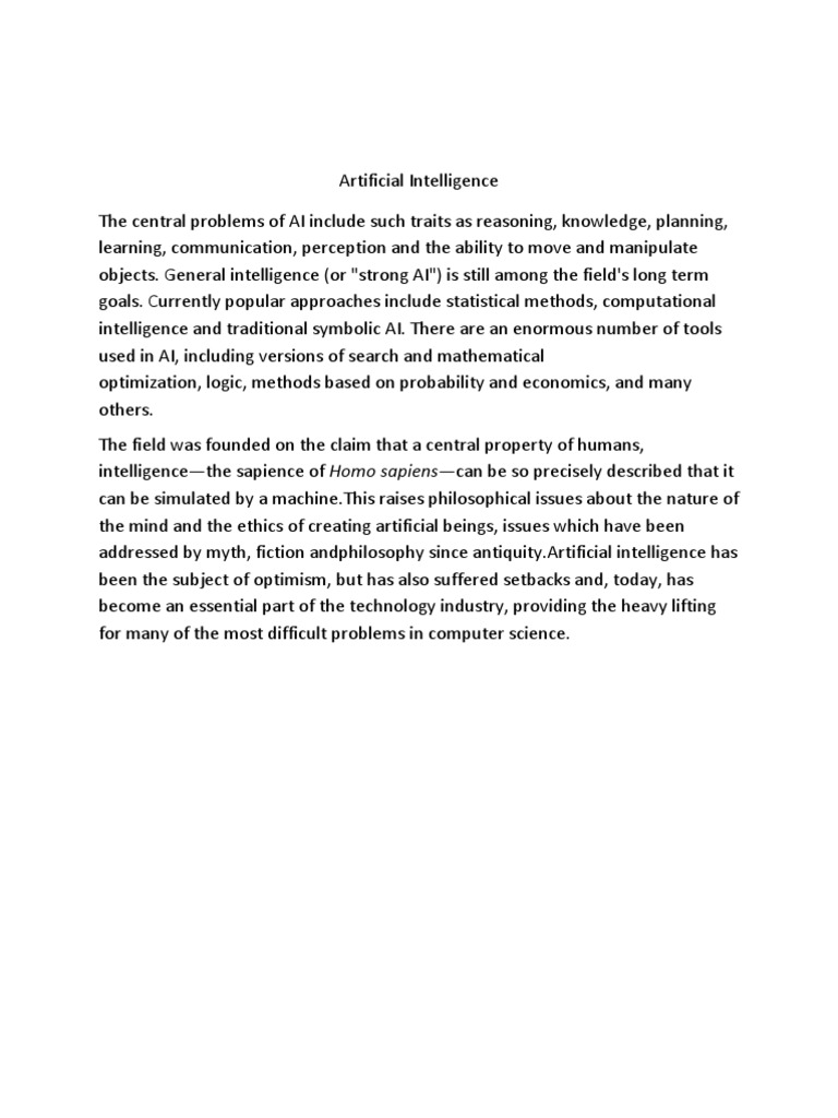 the ability to move and manipulate objects. General intelligence (or "strong AI") is still among the field's long term goals. Currently popular approaches include statistical methods, computational intelligence and traditional symbolic AI. There are an enormous number of tools used in AI, including versions of search and mathematical optimization, logic, methods based on probability and economics, and many others. The field was founded on the claim that a central property of humans, intelligencethe sapience of Homo sapienscan be so precisely described that it can be simulated by a machine.This raises philosophical issues about the nature of the mind and the ethics of creating artificial beings, issues which have been addressed by myth, fiction andphilosophy since antiquity.Artificial intelligence has been the subject of optimism, but has also suffered setbacks and, today, has become an essential part of the technology industry, providing the heavy lifting for many of the most difficult problems in computer science.