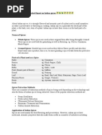 Introduction India produces a wide range of spices. At present, India produces around 3.2 million tonnes of different spices valued at approximately 4 billion US $, and holds a prominent position in world spice production. Because of the varying climates - from tropical to sub-tropical to temperate-almost all spices can be grown in this country. All states and union territories of India, at least one spice is grown in abundance. Around 75 spices out of the 109 spices listed in the ISO list are given here. Types of spices Some of them are Asafetida Pepper Fenugreek Bay leaf Cinnamon Curry leaf Cardamom Clove Fennel Cumin Cinnamon Garlic Ginger Chilli Mint
