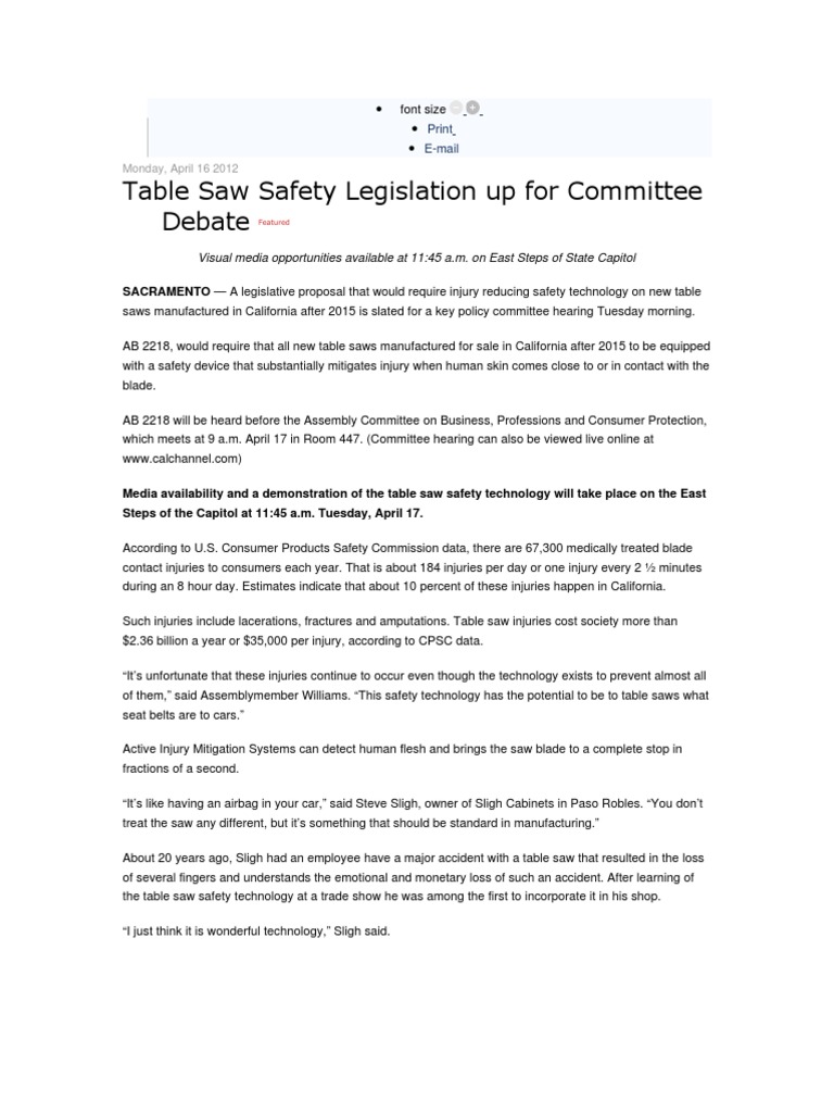 Visual media opportunities available at 11:45 a.m. on East Steps of State Capitol SACRAMENTO A legislative proposal that would require injury reducing safety technology on new table saws manufactured in California after 2015 is slated for a key policy committee hearing Tuesday morning. AB 2218, would require that all new table saws manufactured for sale in California after 2015 to be equipped with a safety device that substantially mitigates injury when human skin comes close to or in contact with the blade. AB 2218 will be heard before the Assembly Committee on Business, Professions and Consumer Protection, which meets at 9 a.m. April 17 in Room 447. (Committee hearing can also be viewed live online at www.calchannel.com) Media availability and a demonstration of the table saw safety technology will take place on the East Steps of the Capitol at 11:45 a.m. Tuesday, April 17. According to U.S. Consumer Products Safety Commission data, there are 67,300 medically treated blade contact injuries to consumers each year. That is about 184 injuries per day or one injury every 2 minutes during an 8 hour day. Estimates indicate that about 10 percent of these injuries happen in California. Such injuries include lacerations, fractures and amputations. Table saw injuries cost society more than $2.36 billion a year or $35,000 per injury, according to CPSC data. Its unfortunate that these injuries continue to occur even though the technology exists to prevent almost all of them, said Assemblymember Williams. This safety technology has the potential to be to table saws what seat belts are to cars. Active Injury Mitigation Systems can detect human flesh and brings the saw blade to a complete stop in fractions of a second. Its like having an airbag in your car, said Steve Sligh, owner of Sligh Cabinets in Paso Robles. You dont treat the saw any different, but its something that should be standard in manufacturing. About 20 years ago, Sligh had an employee have a major accident with a table saw that resulted in the loss of several fingers and understands the emotional and monetary loss of such an accident. After learning of the table saw safety technology at a trade show he was among the first to incorporate it in his shop. I just think it is wonderful technology, Sligh said.
