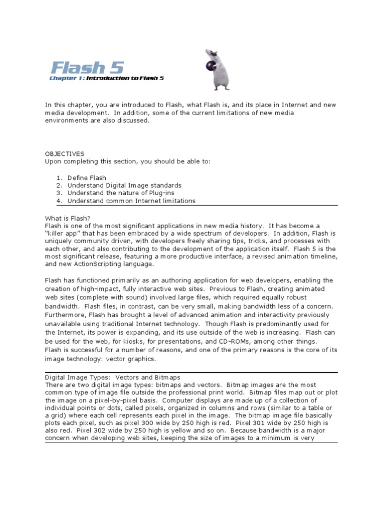 What is Flash? Flash is one of the most significant applications in new media history. It has become a killer app that has been embraced by a wide spectrum of developers. In addition, Flash is uniquely community driven, with developers freely sharing tips, tricks, and processes with each other, and also contributing to the development of the application itself. Flash 5 is the most significant release, featuring a more productive interface, a revised animation timeline, and new ActionScripting language. Flash has functioned primarily as an authoring application for web developers, enabling the creation of high-impact, fully interactive web sites. Previous to Flash, creating animated web sites (complete with sound) involved large files, which required equally robust bandwidth. Flash files, in contrast, can be very small, making bandwidth less of a concern. Furthermore, Flash has brought a level of advanced animation and interactivity previously unavailable using traditional Internet technology. Though Flash is predominantly used for the Internet, its power is expanding, and its use outside of the web is increasing. Flash can be used for the web, for kiosks, for presentations, and CD-ROMs, among other things. Flash is successful for a number of reasons, and one of the primary reasons is the core of its image technology: vector graphics. Digital Image Types: Vectors and Bitmaps There are two digital image types: bitmaps and vectors. Bitmap images are the most common type of image file outside the professional print world. Bitmap files map out or plot the image on a pixel-by-pixel basis. Computer displays are made up of a collection of individual points or dots, called pixels, organized in columns and rows (similar to a table or a grid) where each cell represents each pixel in the image. The bitmap image file basically plots each pixel, such as pixel 300 wide by 250 high is red. Pixel 301 wide by 250 high is also red. Pixel 302 wide by 250 high is yellow and so on. Because bandwidth is a major concern when developing web sites, keeping the size of images to a minimum is very