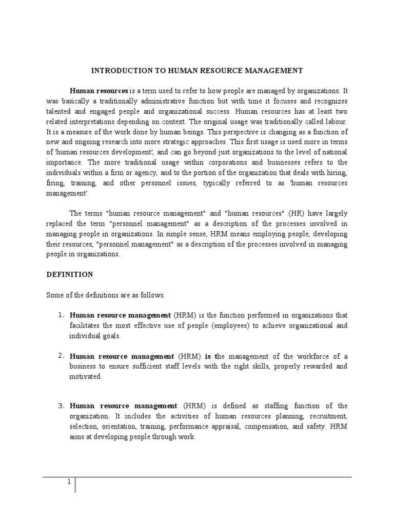 It was basically a traditionally administrative function but with time it focuses and recognizes talented and engaged people and organizational success. Human resources has at least two related interpretations depending on context. The original usage was traditionally called labour. It is a measure of the work done by human beings. This perspective is changing as a function of new and ongoing research into more strategic approaches. This first usage is used more in terms of 'human resources development', and can go beyond just organizations to the level of national importance. The more traditional usage within corporations and businesses refers to the individuals within a firm or agency, and to the portion of the organization that deals with hiring, firing, training, and other personnel issues, typically referred to as 'human resources management'. The terms "human resource management" and "human resources" (HR) have largely replaced the term "personnel management" as a description of the processes involved in managing people in organizations. In simple sense, HRM means employing people, developing their resources, "personnel management" as a description of the processes involved in managing people in organizations. DEFINITION Some of the definitions are as follows.