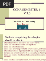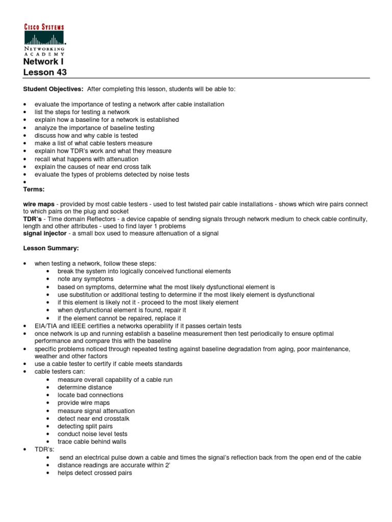 Student Objectives: After completing this lesson, students will be able to: evaluate the importance of testing a network after cable installation list the steps for testing a network explain how a baseline for a network is established analyze the importance of baseline testing discuss how and why cable is tested make a list of what cable testers measure explain how TDR work and what they measure s recall what happens with attenuation explain the causes of near end cross talk evaluate the types of problems detected by noise tests Terms: wire maps - provided by most cable testers - used to test twisted pair cable installations - shows which wire pairs connect to which pairs on the plug and socket TDR - Time domain Reflectors - a device capable of sending signals through network medium to check cable continuity, s length and other attributes - used to find layer 1 problems signal injector - a small box used to measure attenuation of a signal Lesson Summary: when testing a network, follow these steps: break the system into logically conceived functional elements note any symptoms based on symptoms, determine what the most likely dysfunctional element is use substitution or additional testing to determine if the most likely element is dysfunctional if this element is likely not it - proceed to the most likely element when dysfunctional element is found, repair it if the element cannot be repaired, replace it EIA/TIA and IEEE certifies a networks operability if it passes certain tests once network is up and running establish a baseline measurement then test periodically to ensure optimal performance and compare this with the baseline specific problems noticed through repeated testing against baseline degradation from aging, poor maintenance, weather and other factors use a cable tester to certify if cable meets standards cable testers can: measure overall capability of a cable run determine distance locate bad connections provide wire maps measure signal attenuation detect near end crosstalk detecting split pairs conduct noise level tests trace cable behind walls TDR s: send an electrical pulse down a cable and times the signal reflection back from the open end of the cable s distance readings are accurate within 2 helps detect crossed pairs
