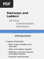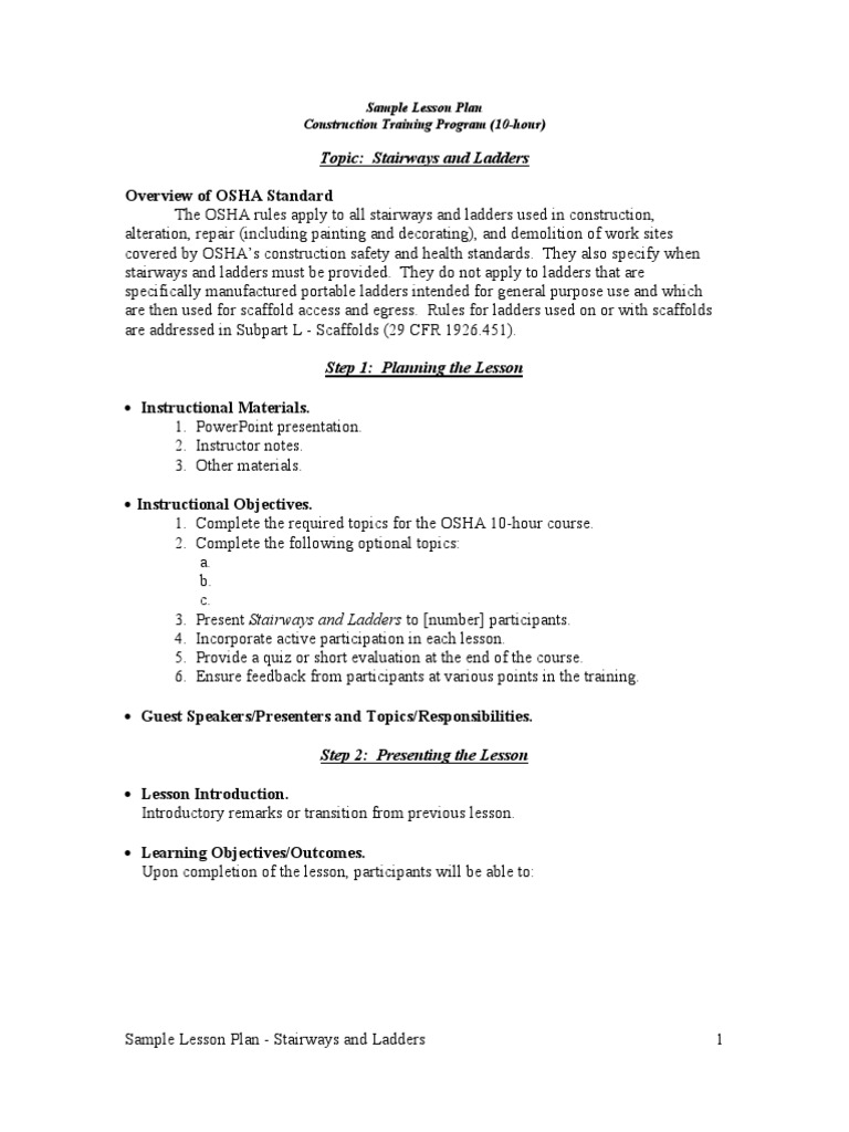 Topic: Stairways and Ladders Overview of OSHA Standard The OSHA rules apply to all stairways and ladders used in construction, alteration, repair (including painting and decorating), and demolition of work sites covered by OSHAs construction safety and health standards. They also specify when stairways and ladders must be provided. They do not apply to ladders that are specifically manufactured portable ladders intended for general purpose use and which are then used for scaffold access and egress. Rules for ladders used on or with scaffolds are addressed in Subpart L - Scaffolds (29 CFR 1926.451). Step 1: Planning the Lesson Instructional Materials. 1. PowerPoint presentation. 2. Instructor notes. 3. Other materials. Instructional Objectives. 1. Complete the required topics for the OSHA 10-hour course. 2. Complete the following optional topics: a. b. c. 3. Present Stairways and Ladders to [number] participants. 4. Incorporate active participation in each lesson. 5. Provide a quiz or short evaluation at the end of the course. 6. Ensure feedback from participants at various points in the training. Guest Speakers/Presenters and Topics/Responsibilities. Step 2: Presenting the Lesson Lesson Introduction. Introductory remarks or transition from previous lesson. Learning Objectives/Outcomes. Upon completion of the lesson, participants will be able to: