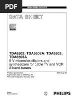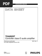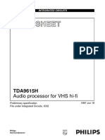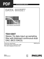 CHARACTERISTICS VDD = + 5 V; VDD1 = 5 V; VDD2 = 12 V; Tamb = + 25 C; measured in Fig. 1; unless otherwise specied. PARAMETER Supply Supply voltage ranges pin 28 pin 26 pin 15 Supply currents pin 28 pin 26 pin 15 Resolution Inputs Input current (pin 3 and pin 4) digital inputs LOW (< 0,8 V) digital inputs HIGH (> 2,0 V) Input frequency at clock input (pin 4) at clock input (pin 2) at data inputs (pin 3 and pin 4) at word select input (pin 1) Input capacitance of digital inputs Oscillator Oscillator frequency with internal capacitor Analogue outputs (AOL; AOR) Output voltage compliance Full scale current Zero scale current Full scale temperature coefcient Tamb = 20 to +70 C Linearity error integral at Tamb = 25 C at Tamb = 20 to +70 C Linearity error differential at Tamb = 25 C at Tamb = 20 to +70 C Ed1 Ed1 0,5 tbf 1 LSB LSB E1 E1 0,5 tbf LSB LSB TCFS 200 10-6 K1 VOC IFS IZS tbf 3,4 4,0 tbf tbf 4,6 mV mA nA fosc 150 200 250 kHz fSCK fBCK fDAT fWS CI 12 12 6 6 200 MHz MHz MHz kHz pF IIL IIH tbf tbf mA A IDD IDDI IDD2 Res 45 45 25 16 tbf tbf tbf mA mA mA bits VDD VDD1 VDD2 4,0 4,5 14 5,0 5,0 15 6,0 6,0 16 V V V SYMBOL MIN. TYP. MAX. UNIT