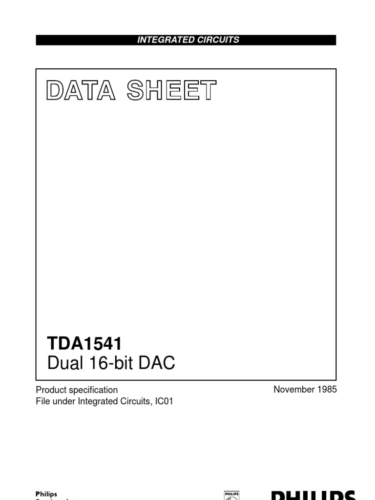 The TDA1541 is a monolithic integrated dual 16-bit digital-to-analogue converter (DAC) designed for use in hi-fi digital audio equipment such as Compact Disc players, digital tape or cassette recorders. Features Selectable two-channel input format: offset binary or twos complement Internal timing and control circuit TTL compatible digital inputs High maximum input bit-rate and fast settling time. QUICK REFERENCE DATA Supply voltages pin 28 pin 26 pin 15 Supply currents pin 28 pin 26 pin 15 Signal-to-noise ratio (full scale sine-wave) at analogue outputs (AOL; AOR) Non-linearity at Tamb = 20 to +70 C Current settling time to 1 LSB Maximum input bit rate at data input (pin 3) Maximum clock frequency at clock input (pin 2) at clock input (pin 4) Full scale temperature coefcient at analogue outputs (AOL; AOR) Operating ambient temperature range Total power dissipation PACKAGE OUTLINE 28-lead DIL; plastic (with internal heat spreader) (SOT-117); SOT117-1; 1996 August 14. TCFS Tamb Ptot typ. typ. 200 106 20 to +70 850 K1 C mW fBCKmax fSCKmax min. min. 6 12 MHz MHz BRmax min. 6 Mbits/s tcs typ. typ.