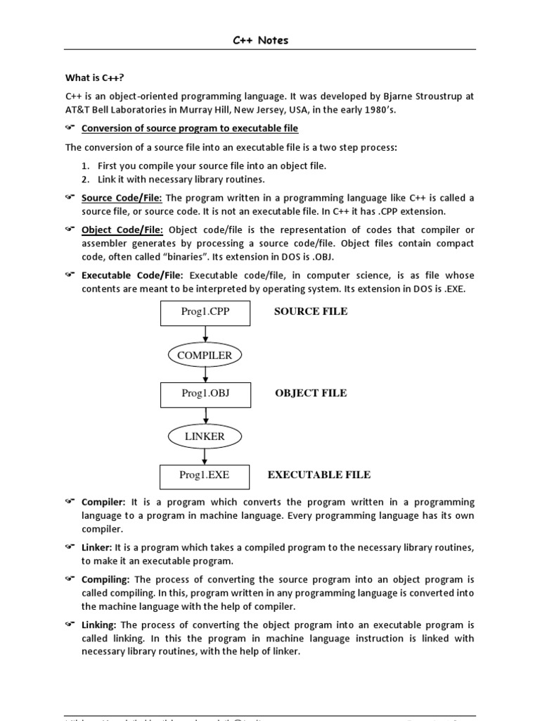 It was developed by Bjarne Stroustrup at AT&T Bell Laboratories in Murray Hill, New Jersey, USA, in the early 1980s. Conversion of source program to executable file The conversion of a source file into an executable file is a two step process: 1. First you compile your source file into an object file. 2. Link it with necessary library routines. Source Code/File: The program written in a programming language like C++ is called a source file, or source code. It is not an executable file. In C++ it has .CPP extension. Object Code/File: Object code/file is the representation of codes that compiler or assembler generates by processing a source code/file. Object files contain compact code, often called binaries. Its extension in DOS is .OBJ. Executable Code/File: Executable code/file, in computer science, is as file whose contents are meant to be interpreted by operating system. Its extension in DOS is .EXE. Prog1.CPP SOURCE FILE