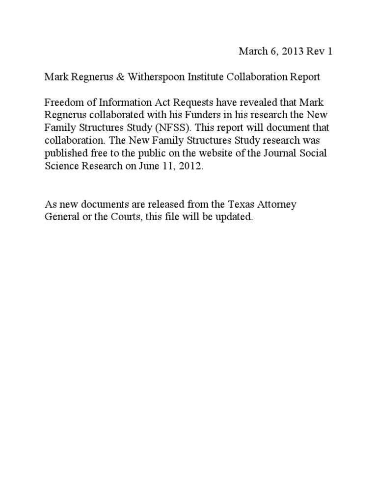 revealed that Mark Regnerus collaborated with his Funders in his research the New Family Structures Study (NFSS). This report will document that collaboration. The New Family Structures Study research was published free to the public on the website of the Journal Social Science Research on June 11, 2012. As new documents are released from the Texas Attorney General or the Courts, this file will be updated.