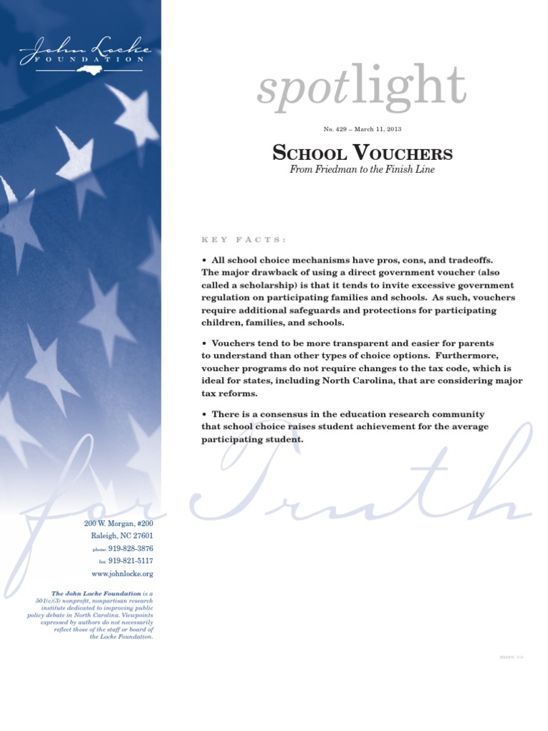 1. Milton Friedman, The Role of Government in Education, in Robert Solo (ed.), Economics and the Public Interest, Rutgers University Press, 1955. 2. Ibid. 3. The Friedman Foundation for Educational Choice, The ABCs of School Choice: The comprehensive guide to every private school choice program in America, January 2013, edchoice.org/Foundation-Services/Publications/2013-ABCs-of-School-Choice.aspx. 4. He blamed that failure on the political heft of the public school establishment and their teacher union allies. See Milton Friedman, Public schools: Make them private, The Washington Post, February 19, 1995. He wrote, With minor exceptions, no one has succeeded in getting a voucher system adopted, thanks primarily to the political power of the school establishment, more recently reinforced by the National Education Association and the American Federation of Teachers, together the strongest political lobbying body in the United States. See also Milton Friedman, Whats Wrong with Our Schools? in Free to Choose: A Personal Statement, 1980. He wrote, The perceived self-interest of the educational bureaucracy is the key obstacle to the introduction of market competition in schooling. 5. This is one of the most underappreciated economic principles in the school choice movement today. Taxpayer savings is not the difference between the per-pupil expenditure and the value of the voucher. For example, a state may report a per pupil expenditure of $8,000 and offer a voucher of $5,000, but the taxpayer does not necessarily save $3,000. Rather, the savings depend on the amount of the per pupil expenditure that is used to pay for fixed costs, including facilities and personnel that must still be funded even after the student withdraws from the public school. Savings also depend on the elasticity of demand, that is, variations in the way that families respond to the price (and availability) of private school. The demand for vouchers will not be perfect or fixed but will change through time. Typically, demand will decline through time, thereby altering the projected savings of a voucher program in subsequent years. A third factor to consider is the dead weight cost associated with providing vouchers to students who did not previously attend a public school, such as children in kindergarten. Finally, the design of the state funding formula is a critical variable in determining cost savings, particularly the savings enjoyed by individual school districts. Because the state funding formula does not allot funds equitably across school districts, some districts will realize more savings than others. 6. Friedman Foundation, ABCs of School Choice, p. 85-86. 7. Indiana Choice Scholarship cap for 2013. 8. Parental Private School Choice Program (Racine) cap for 2013. 9. Given the choice between determining eligibility by income or eligibility based on school performance, a system that awards scholarships based on the performance of the school appears to be the preferred option. The Milwaukee Parental Choice Program and the discontinued Florida Opportunity Scholarship Program represent two different approaches to school vouchers. The Milwaukee approach is a means-tested scholarship program, originally designed to provide financial assistance to low-income families in a single city school district. Floridas program was focused on giving children in low-performing schools (so-called F schools) statewide the resources to attend private schools. The Florida Supreme Court declared the private school scholarship portion unconstitutional in 2006, but public school students still have the option of transferring to a higher performing public school. In a series of quantitative studies, Rajashri Chakrabarti, an economist at the Federal Reserve Bank of New York, compared the performance of scholarship students in Milwaukee and Florida. Chakrabarti asked whether the design of a scholarship program had any bearing on student performance. She concluded that it did. According to the author, the Florida program led to considerably larger improvements from the threatened schools compared with corresponding schools under the Milwaukee program. She found that the structure of Floridas program provided a greater incentive for schools to improve than the Milwaukee approach. See Rajashri Chakrabarti, Scholarships, Public School Response, and the Role of Incentives: Evidence from Florida, Federal Reserve Bank of New York Staff Reports, no. 306, October 2007. Chakrabarti, Can Increasing Private School Participation and Monetary Loss in a Scholarship Program Affect Public School Performance? Evidence from Milwaukee. Journal of Public Economics vol. 92, no. 5-6, June 2008, p. 1371-93. Chakrabarti, Impact of Scholarship Design on Public School Performance: Evidence from Florida and Milwaukee Scholarship Programs, Federal Reserve Bank of New York Staff Reports, no. 315, January 2008. Chakrabarti, Do Scholarships Lead to Sorting under Random Private- School Selection? Evidence from the Milwaukee Scholarship Program, Federal Reserve Bank of New York Staff Reports, no. 379, July 2009. 10. Andrew J. Coulson, Do Scholarships and Tax Credits Increase Private School Regulation? Cato Working Paper, No. 1 October 4, 2010. 11. Adam B. Schaeffer, The Public Education Tax Credit, Cato Institute Policy Analysis No. 605, December 5, 2007, cato.org/publications/policyanalysis/public-education-tax-credit. 12. North Carolina State Constitution, Article IX, Section 2: Education ncleg.net/Legislation/constitution/ncconstitution.html 13. David Roland, School Choice And The North Carolina Constitution, Institute for Justice and the N.C. Education Alliance, April 2006, johnlocke.org/acrobat/policyReports/school_choice-constitution.pdf. Jeanette Doran, School Choice Scholarship Programs Would Not Violate the First Amendment of the U.S. Constitution, North Carolina Institute for Constitutional Law, November 6, 2012, ncicl.org/article/793. 14. For an excellent summary of
