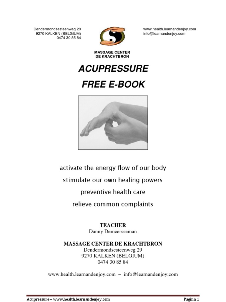 This is the free version of our eBook acupressure. You only see the description with pictures of 3 acupressure points. So you get an idea of the full version. The table of contents provides an overview of what is discussed in the full eBook. The full eBook acupressure describes 78 acupressure points and has a complete alphabetical complaints list so you know which symptoms you can relieve with which acupressure points. Our full eBook costs 10,00 euro. You can order our FULL eBook acupressur online: 1. Send an email to info@digitown.be and order the full eBook acupressure. 2. Pay 10,00 euro with PayPal at info@digitown.be 3. When weve checked your payment youll receive the eBook by email. This free eBook acupressure is a product of Massage Center De Krachtbron and may be freely distributed without permission, provided you mention our name.