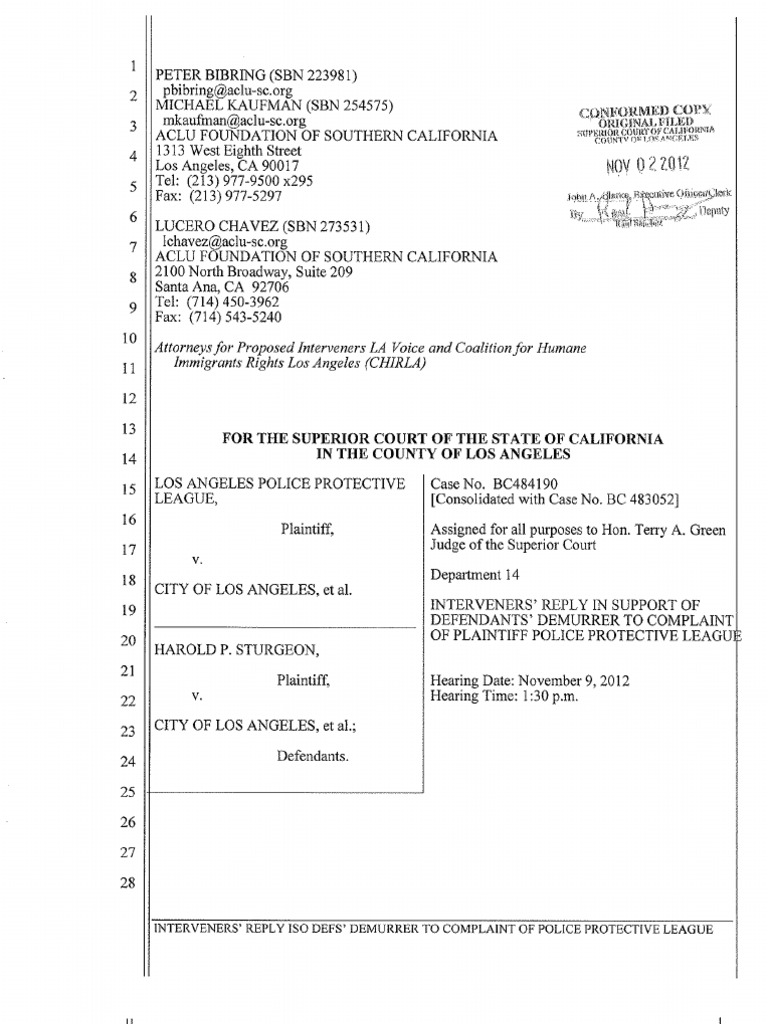 LA Voice & CHIRLA’s Reply in Support of Defendants’ Demurrer to the Complaint of Plaintiff Los Angeles Police Protective League - LA Voice & CHIRLA’s Reply to the Plaintiff’s opposition to the City’s demurrer