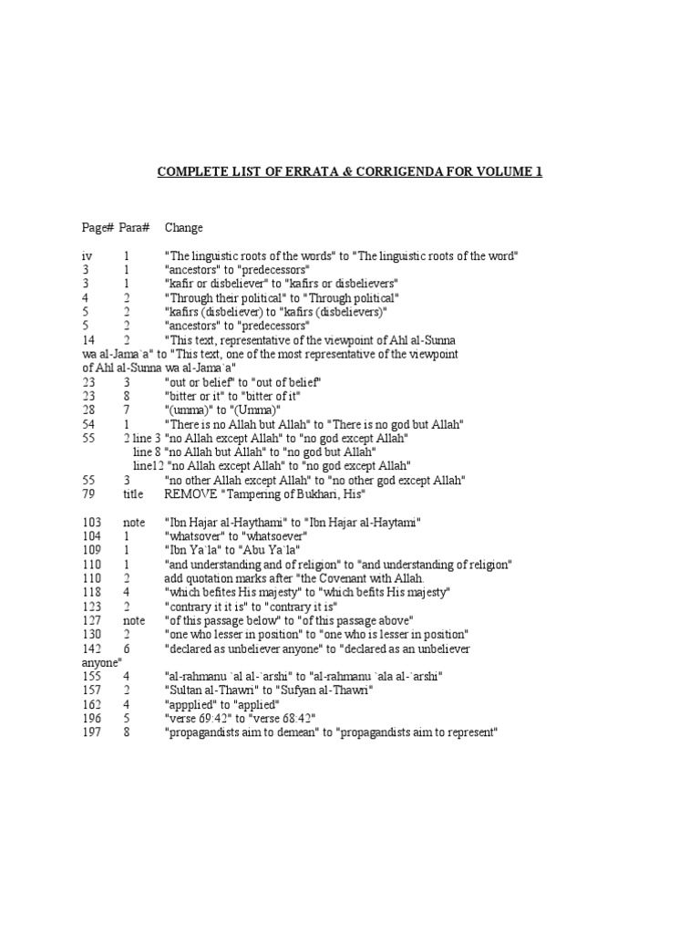 iv 1 "The linguistic roots of the words" to "The linguistic roots of the word" 3 1 "ancestors" to "predecessors" 3 1 "kafir or disbeliever" to "kafirs or disbelievers" 4 2 "Through their political" to "Through political" 5 2 "kafirs (disbeliever) to "kafirs (disbelievers)" 5 2 "ancestors" to "predecessors" 14 2 "This text, representative of the viewpoint of Ahl al-Sunna wa al-Jama`a" to "This text, one of the most representative of the viewpoint of Ahl al-Sunna wa al-Jama`a" 23 3 "out or belief" to "out of belief" 23 8 "bitter or it" to "bitter of it" 28 7 "(umma)" to "(Umma)" 54 1 "There is no Allah but Allah" to "There is no god but Allah" 55 2 line 3 "no Allah except Allah" to "no god except Allah" line 8 "no Allah but Allah" to "no god but Allah" line12 "no Allah except Allah" to "no god except Allah" 55 3 "no other Allah except Allah" to "no other god except Allah" 79 title REMOVE "Tampering of Bukhari, His" 103 note 104 1 109 1 110 1 110 2 118 4 123 2 127 note 130 2 142 6 anyone" 155 4 157 2 162 4 196 5 197 8 "Ibn Hajar al-Haythami" to "Ibn Hajar al-Haytami" "whatsover" to "whatsoever" "Ibn Ya`la" to "Abu Ya`la" "and understanding and of religion" to "and understanding of religion" add quotation marks after "the Covenant with Allah. "which befites His majesty" to "which befits His majesty" "contrary it it is" to "contrary it is" "of this passage below" to "of this passage above" "one who lesser in position" to "one who is lesser in position" "declared as unbeliever anyone" to "declared as an unbeliever "al-rahmanu `al al-`arshi" to "al-rahmanu `ala al-`arshi" "Sultan al-Thawri" to "Sufyan al-Thawri" "appplied" to "applied" "verse 69:42" to "verse 68:42" "propagandists aim to demean" to "propagandists aim to represent"