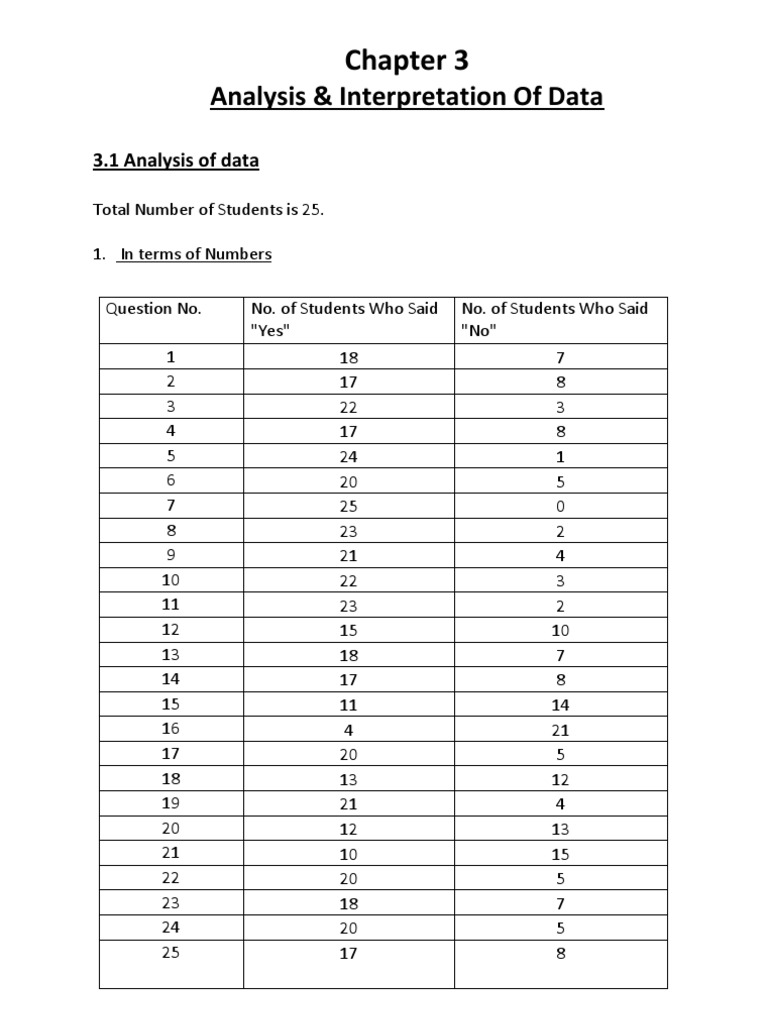 Total Number of Students is 25. 1. In terms of Numbers Question No. 1 2 3 4 5 6 7 8 9 10 11 12 13 14 15 16 17 18 19 20 21 22 23 24 25 No. of Students Who Said "Yes" 18 17 22 17 24 20 25 23 21 22 23 15 18 17 11 4 20 13 21 12 10 20 18 20 17 No. of Students Who Said "No" 7 8 3 8 1 5 0 2 4 3 2 10 7 8 14 21 5 12 4 13 15 5 7 5 8