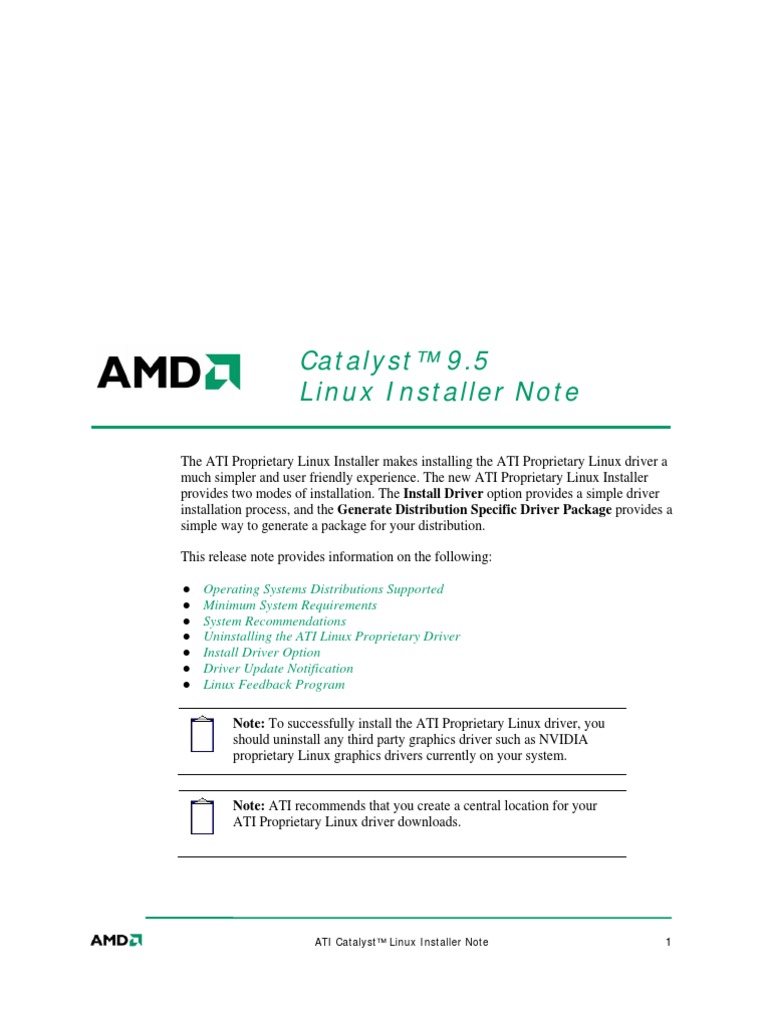 Operating Systems Distributions Supported Minimum System Requirements System Recommendations Uninstalling the ATI Linux Proprietary Driver Install Driver Option Driver Update Notification Linux Feedback Program Note: To successfully install the ATI Proprietary Linux driver, you should uninstall any third party graphics driver such as NVIDIA proprietary Linux graphics drivers currently on your system.