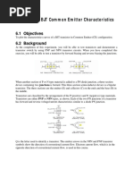 Figure 9.1 Transistor Test Circuit 1. The circuit is connected as shown in the Figure 9.1. The power supplies VCC and VBB should be at zero before turning on the power supply. 2. The power supply VCC is turned on but the VBB remains off. The VCC are gradually being increased its output until VCE reads 3V. The values of IC are being taken are recorded. The voltage being measured is VCE and not VCC. 3. The values of VCC are continually being increased until VCE reads values of 5V, 10V, 15V and 20V. In every case, the values of the IC are being taken and recorded. 4. The power supply of VCC is turned to zero while VBB are being turned on. Its values are increased until the values of IB read 10A. 5. The values of VCC are being adjusted so the VCE reads 3V, 5V, 10V, 15V, and 20V. In every case, the values of IC are measured in the same time the IB should be kept constant at 10A. 6. Before repeat step 5, the IB is increased to 20A. 7. The values of IB are now increased to 30A, 40A, 50A, 60A, and 70A. For every values of IB, the step 5 is repeated as to measure the values of IB. 8. The results obtained are recorded into Table 1. A graph of IC versus VCE is plotted on a graph paper. 9. By referring the graph that had been drawn, a load line are drawn in the graph by select an appropriate point at the center of the graph and then draw a straight line from VCC=20v, pass through the selected center point and the line are extended to the x-axis. The transistor parameter defining this condition are: a) IBQ for the quiescent base current b) ICQ for the quiescent collector current c) VCEQ for the quiescent collector-emitter voltage These values are read and recorded in the Table 2. These parameters are important as it enable the calculation and set the transistor biasing necessary for linear operation. 10. Alpha() and Beta() are two parameters that used to defining the DC current gain of the transistor for the common-emitter configurations. From the collector characteristics curves, Beta can be determined at the operating point by : =IC/IB