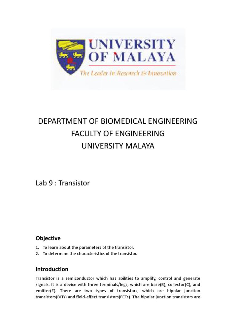 Transistor is a semiconductor which has abilities to amplify, control and generate signals. It is a device with three terminals/legs, which are base(B), collector(C), and emitter(E). There are two types of transistors, which are bipolar junction transistors(BJTs) and field-effect transistors(FETs). The bipolar junction transistors are