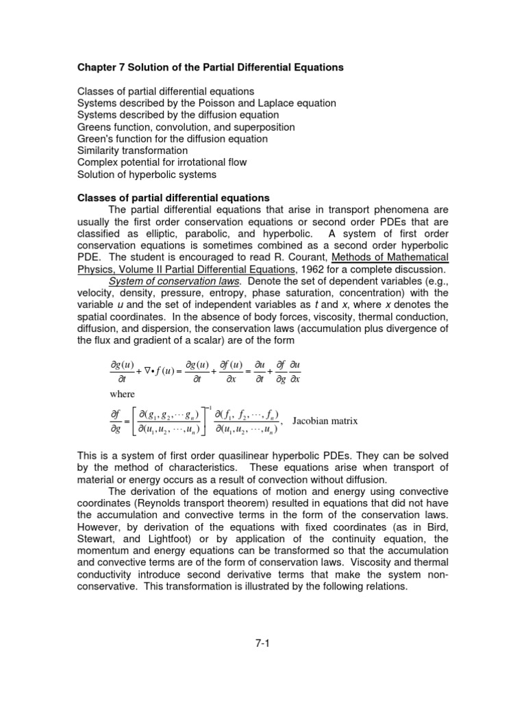 Laplace equation Systems described by the diffusion equation Greens function, convolution, and superposition Green's function for the diffusion equation Similarity transformation Complex potential for irrotational flow Solution of hyperbolic systems Classes of partial differential equations The partial differential equations that arise in transport phenomena are usually the first order conservation equations or second order PDEs that are classified as elliptic, parabolic, and hyperbolic. A system of first order conservation equations is sometimes combined as a second order hyperbolic PDE. The student is encouraged to read R. Courant, Methods of Mathematical Physics, Volume II Partial Differential Equations, 1962 for a complete discussion. System of conservation laws. Denote the set of dependent variables (e.g., velocity, density, pressure, entropy, phase saturation, concentration) with the variable u and the set of independent variables as t and x, where x denotes the spatial coordinates. In the absence of body forces, viscosity, thermal conduction, diffusion, and dispersion, the conservation laws (accumulation plus divergence of the flux and gradient of a scalar) are of the form g (u ) g (u ) f (u ) u f u + i f (u ) = + = + t t x t g x where f ( g1 , g 2 , g n ) ( f1 , f 2 , = g (u1 , u2 , , un ) (u1 , u2 ,