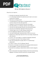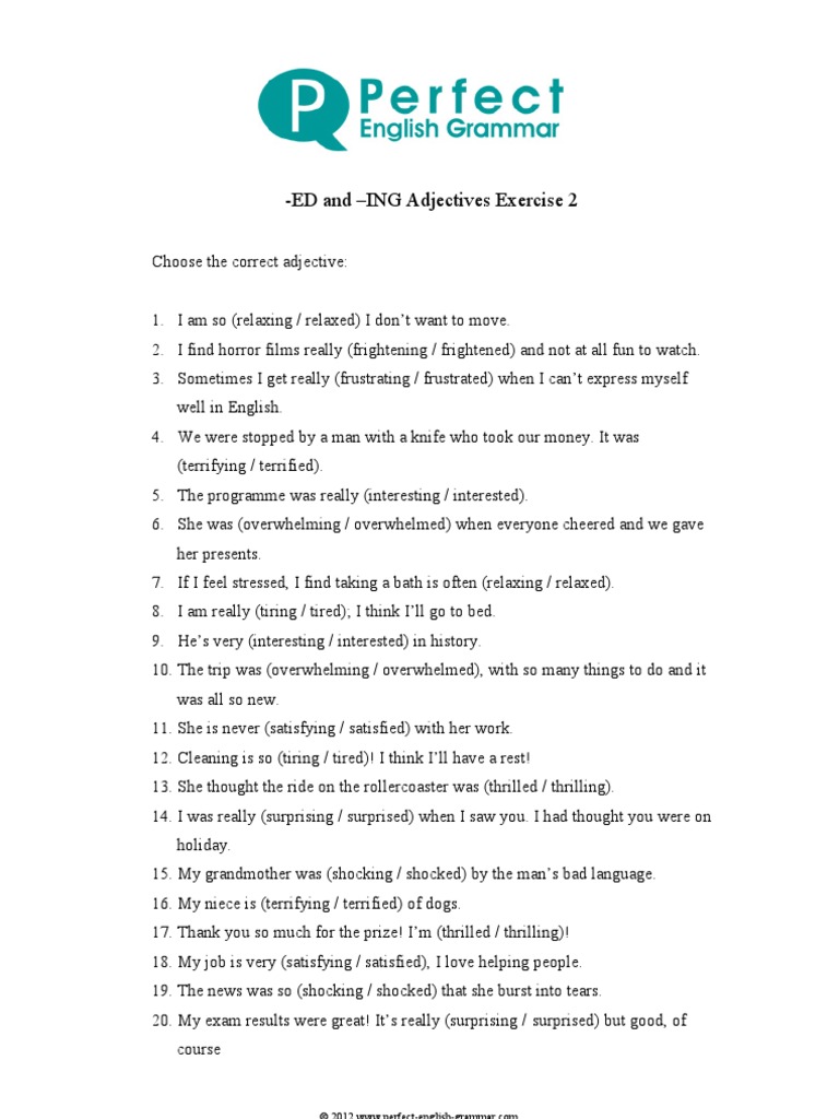 1. I am so (relaxing / relaxed) I dont want to move. 2. I find horror films really (frightening / frightened) and not at all fun to watch. 3. Sometimes I get really (frustrating / frustrated) when I cant express myself well in English. 4. We were stopped by a man with a knife who took our money. It was (terrifying / terrified). 5. The programme was really (interesting / interested). 6. She was (overwhelming / overwhelmed) when everyone cheered and we gave her presents. 7. If I feel stressed, I find taking a bath is often (relaxing / relaxed). 8. I am really (tiring / tired); I think Ill go to bed. 9. Hes very (interesting / interested) in history. 10. The trip was (overwhelming / overwhelmed), with so many things to do and it was all so new. 11. She is never (satisfying / satisfied) with her work. 12. Cleaning is so (tiring / tired)! I think Ill have a rest! 13. She thought the ride on the rollercoaster was (thrilled / thrilling). 14. I was really (surprising / surprised) when I saw you. I had thought you were on holiday. 15. My grandmother was (shocking / shocked) by the mans bad language. 16. My niece is (terrifying / terrified) of dogs. 17. Thank you so much for the prize! Im (thrilled / thrilling)! 18. My job is very (satisfying / satisfied), I love helping people. 19. The news was so (shocking / shocked) that she burst into tears. 20. My exam results were great! Its really (surprising / surprised) but good, of course