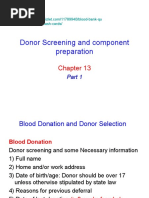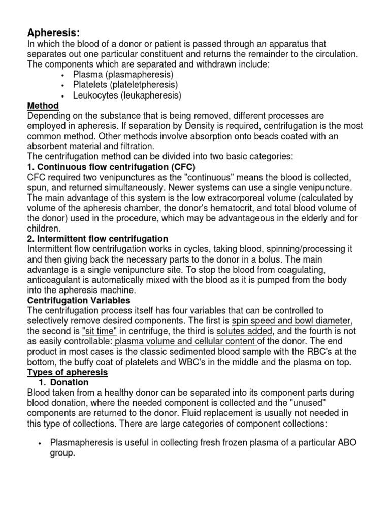 In which the blood of a donor or patient is passed through an apparatus that separates out one particular constituent and returns the remainder to the circulation. The components which are separated and withdrawn include: Plasma (plasmapheresis) Platelets (plateletpheresis) Leukocytes (leukapheresis) Method Depending on the substance that is being removed, different processes are employed in apheresis. If separation by Density is required, centrifugation is the most common method. Other methods involve absorption onto beads coated with an absorbent material and filtration. The centrifugation method can be divided into two basic categories: 1. Continuous flow centrifugation (CFC) CFC required two venipunctures as the "continuous" means the blood is collected, spun, and returned simultaneously. Newer systems can use a single venipuncture. The main advantage of this system is the low extracorporeal volume (calculated by volume of the apheresis chamber, the donor's hematocrit, and total blood volume of the donor) used in the procedure, which may be advantageous in the elderly and for children. 2. Intermittent flow centrifugation Intermittent flow centrifugation works in cycles, taking blood, spinning/processing it and then giving back the necessary parts to the donor in a bolus. The main advantage is a single venipuncture site. To stop the blood from coagulating, anticoagulant is automatically mixed with the blood as it is pumped from the body into the apheresis machine. Centrifugation Variables The centrifugation process itself has four variables that can be controlled to selectively remove desired components. The first is spin speed and bowl diameter, the second is "sit time" in centrifuge, the third is solutes added, and the fourth is not as easily controllable: plasma volume and cellular content of the donor. The end product in most cases is the classic sedimented blood sample with the RBC's at the bottom, the buffy coat of platelets and WBC's in the middle and the plasma on top. Types of apheresis 1. Donation Blood taken from a healthy donor can be separated into its component parts during blood donation, where the needed component is collected and the "unused" components are returned to the donor. Fluid replacement is usually not needed in this type of collections. There are large categories of component collections: